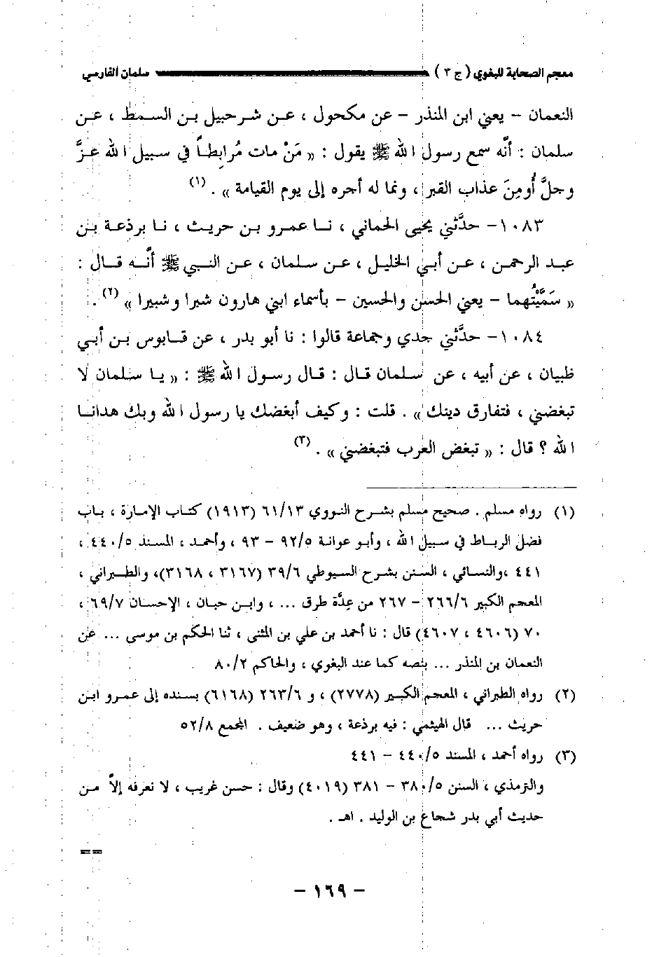 ١٠٨٤ - حدثني جدي وجماعة قالوا: نا أبو بدر عن قابوس بن أبي ظبيان عن أبيه عن سلمان قال: قال رسول الله صلى الله عليه وسلم: " ياسلمان لا تبغضني فتفارق دينك ". قلت: وكيف أبغضك يارسول الله وبك هدانا الله؟ قال: " تبغض العرب فتبغضني.