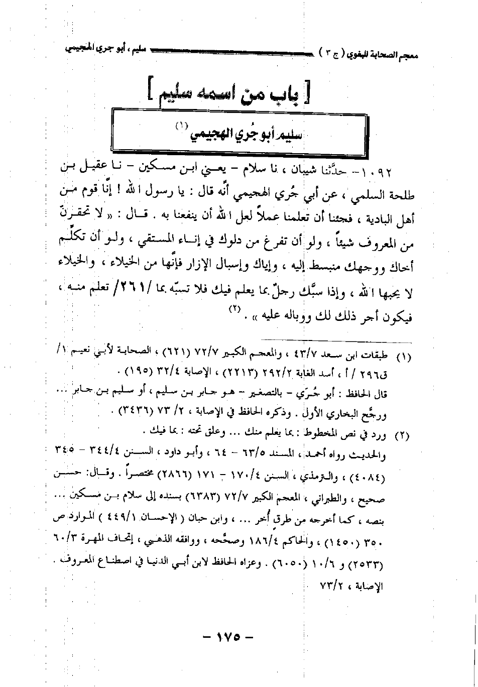 ١٠٩٢ - حدثنا شيبان نا سلام يعني ابن مسكين نا عقيل بن طلحة السلمي عن أبي جري الهجيمي أنه قال: يارسول الله! إنا قوم من أهل البادية فجئنا أن تعلمنا عملا لعل الله أن ينفعنا به. قال: " لا تحقرن من المعروف شيئا ولو أن تفرغ من دلوك في إناء المستقي ولو أن تكلم أخاك ووجهك منبسط إليه وإياك وإسبال الإزار فإنها من الخيلاء والخيلاء لا يحبها الله وإذا سبك رجل بما تعلم فيك فلا تسبه//٢٦١// بما تعلم منه فيكون أجر ذلك لك ووباله عليه.