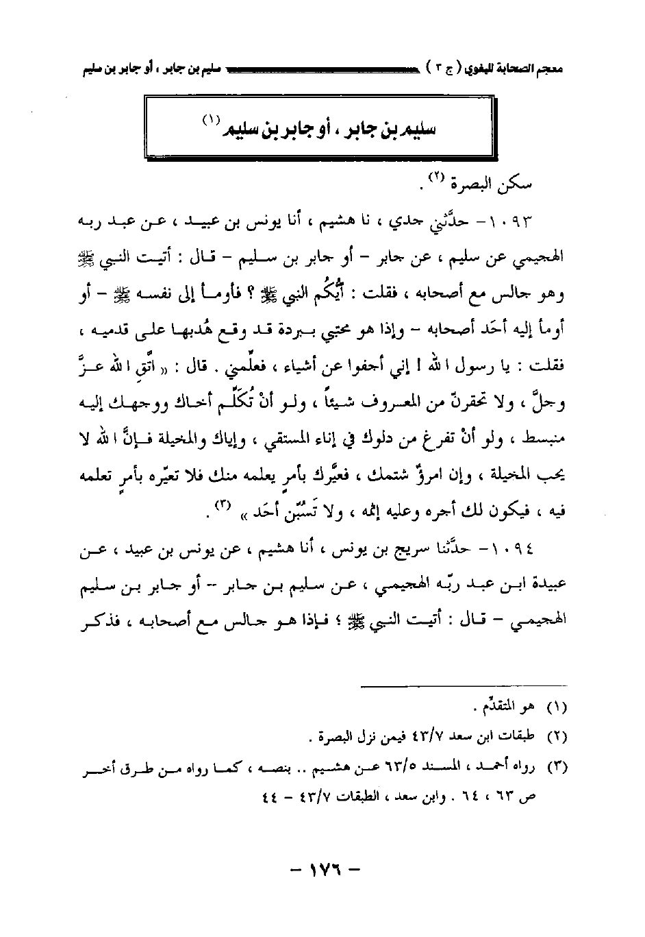 ١٠٩٣ - حدثني جدي نا هشيم أخبرنا يونس بن عبيد عن عبد ربه الهجيمي عن سليم عن جابر أو جابر بن سليم قال: أتيت النبي صلى الله عليه وسلم وهو جالس مع أصحابه فقلت: أيكم النبي صلى الله عليه وسلم؟ فأومأ إلى نفسه صلى الله عليه وسلم أو أومأ إليه أحد أصحابه وإذا هو محتبي ببردة قد وقع هدبها على قدميه فقلت: يارسول الله! إني أجفوا عن أشياء فعلمني. قال: " اتق الله عز وجل ولا تحقرن من المعروف - ل٩/ب - شيئا ولو أن تكلم أخاك ووجهك إليه منبسط ولو أن تفرغ من دلوك في إناء المستقي وإياك والمخيلة فإن الله لا يحب المخيلة وإن امرؤ شتمك فعيرك بأمر يعلمه منك فلا تعيره بأمر تعلمه فيه فيكون لك أجره وعليه إثمه ولا تسبن أحد.