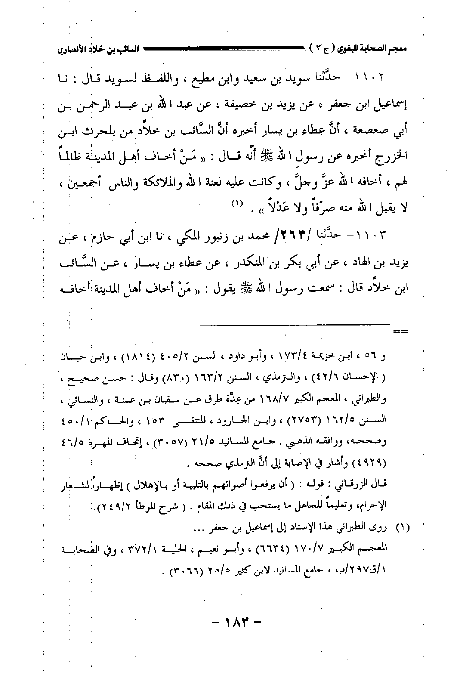 ١١٠٣ - حدثنا // ٢٦٣// محمد بن زنبور المكي نا ابن أبي حازم عن يزيد بن الهاد عن أبي بكر بن المنكدر عن عطاء بن يسار عن السائب بن خلاد قال: سمعت رسول الله صلى الله عليه وسلم يقول: " من أخاف أهل المدينة أخافه
