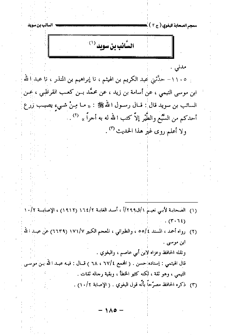 ١١٠٥ - حدثني عبد الكريم بن الهيثم نا إبراهيم بن المنذر نا عبد الله بن موسى عن أسامة بن زيد عن محمد بن كعب القرظي عن السائب بن سويد قال: قال رسول الله صلى الله عليه وسلم: " ما من شيء يصيب زرع أحدكم من السبع والطير إلا كتب الله له به أجرا.