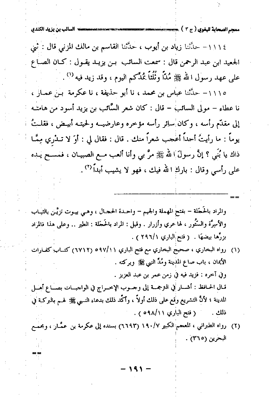 ١١١٤ - حدثنا زياد بن أيوب حدثنا القاسم بن مالك المزني قال: حدثني الجعيد بن عبد الرحمن قال: سمعت السائب بن يزيد يقول: كان الصاع على عهد رسول الله صلى الله عليه وسلم مدا وثلثا بمدكم اليوم وقد زيد فيه.