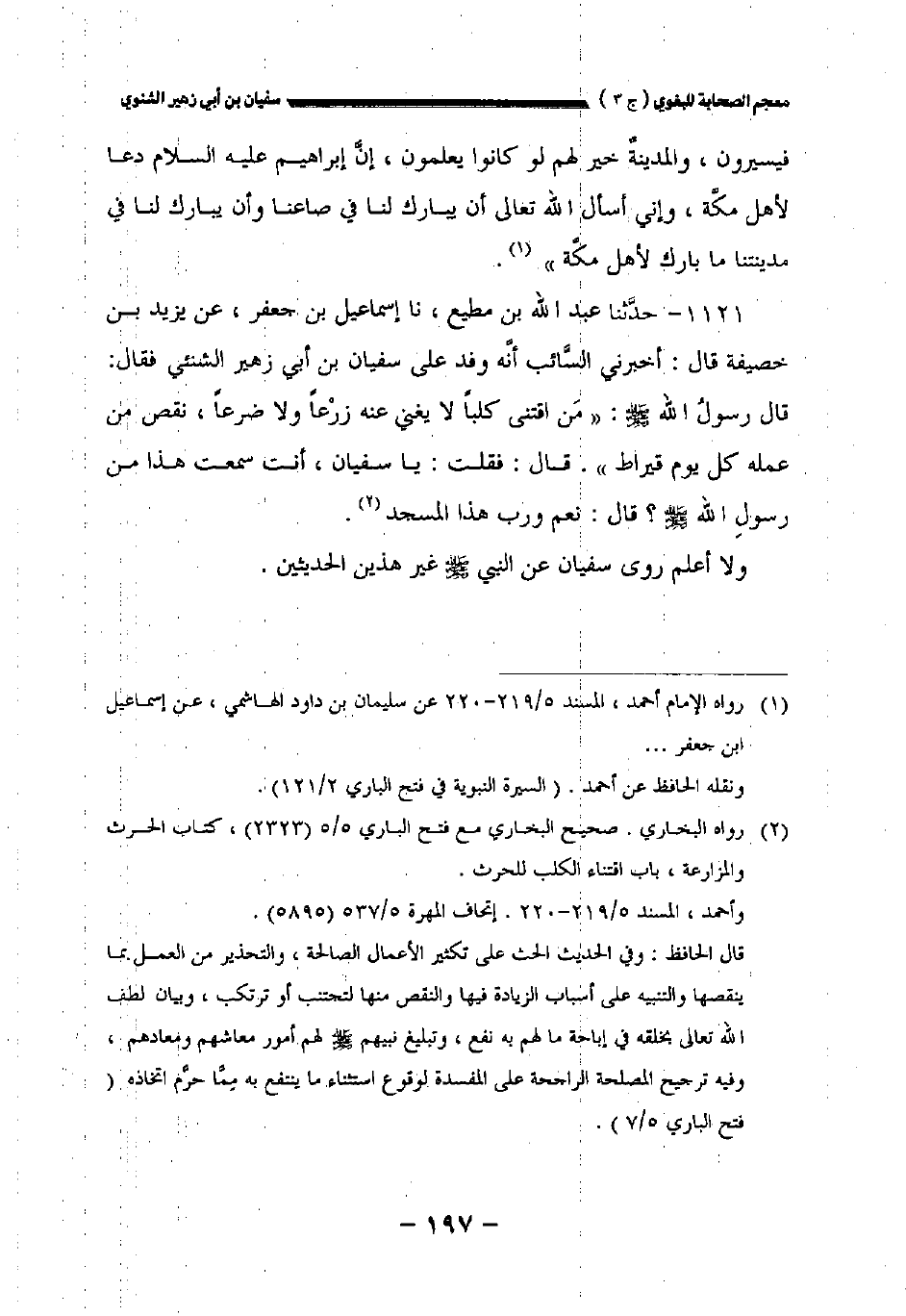 ١١٢١ - حدثنا عبد الله بن مطيع نا إسماعيل بن جعفر عن يزيد بن خصيفة قال: أخبرني السائب أنه وفد على سفيان بن أبي زهير الشني فقال: قال رسول الله صلى الله عليه وسلم: " من اقتنى كلبا لا يغني عنه زرعا ولا ضرعا نقص من عمله كل يوم قيراط ". قال: فقلت: ياسفيان أنت سمعت هذا من رسول الله صلى الله عليه وسلم؟ قال: نعم ورب هذا المسجد.