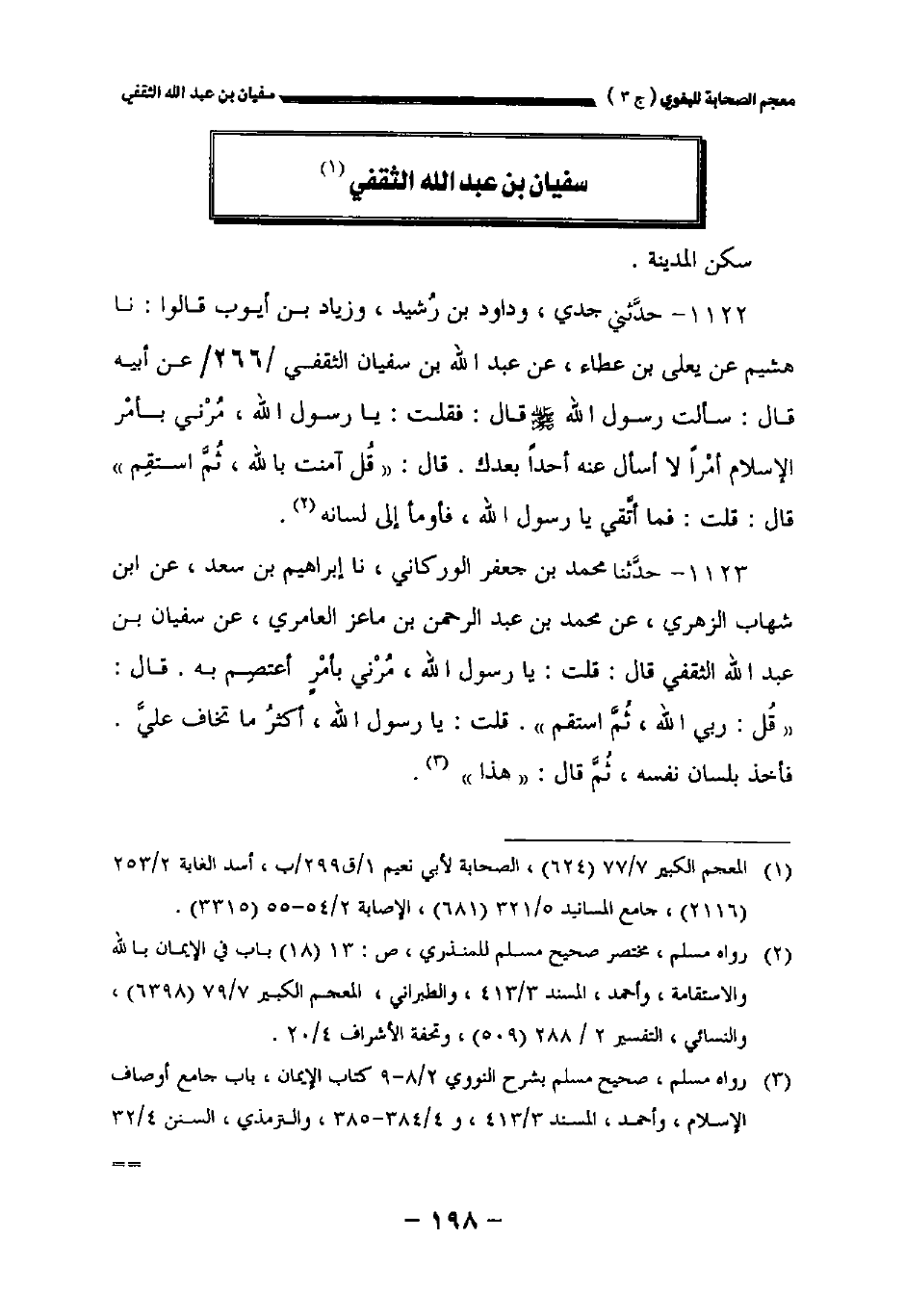 ١١٢٢ - حدثني جدي وداود بن رشيد وزياد بن أيوب قالوا: نا هشيم عن يعلى بن عطاء عن عبد الله بن سفيان الثقفي//٢٦٦// عن أبيه قال: سألت رسول الله صلى الله عليه وسلم قال: فقلت: يارسول الله مرني بأمر الإسلام أمرا لا أسأل عنه أحدا بعدك. قال: " قل آمنت بالله ثم استقم " قال: قلت: فما أتقي يارسول الله فأومأ إلى لسانه.