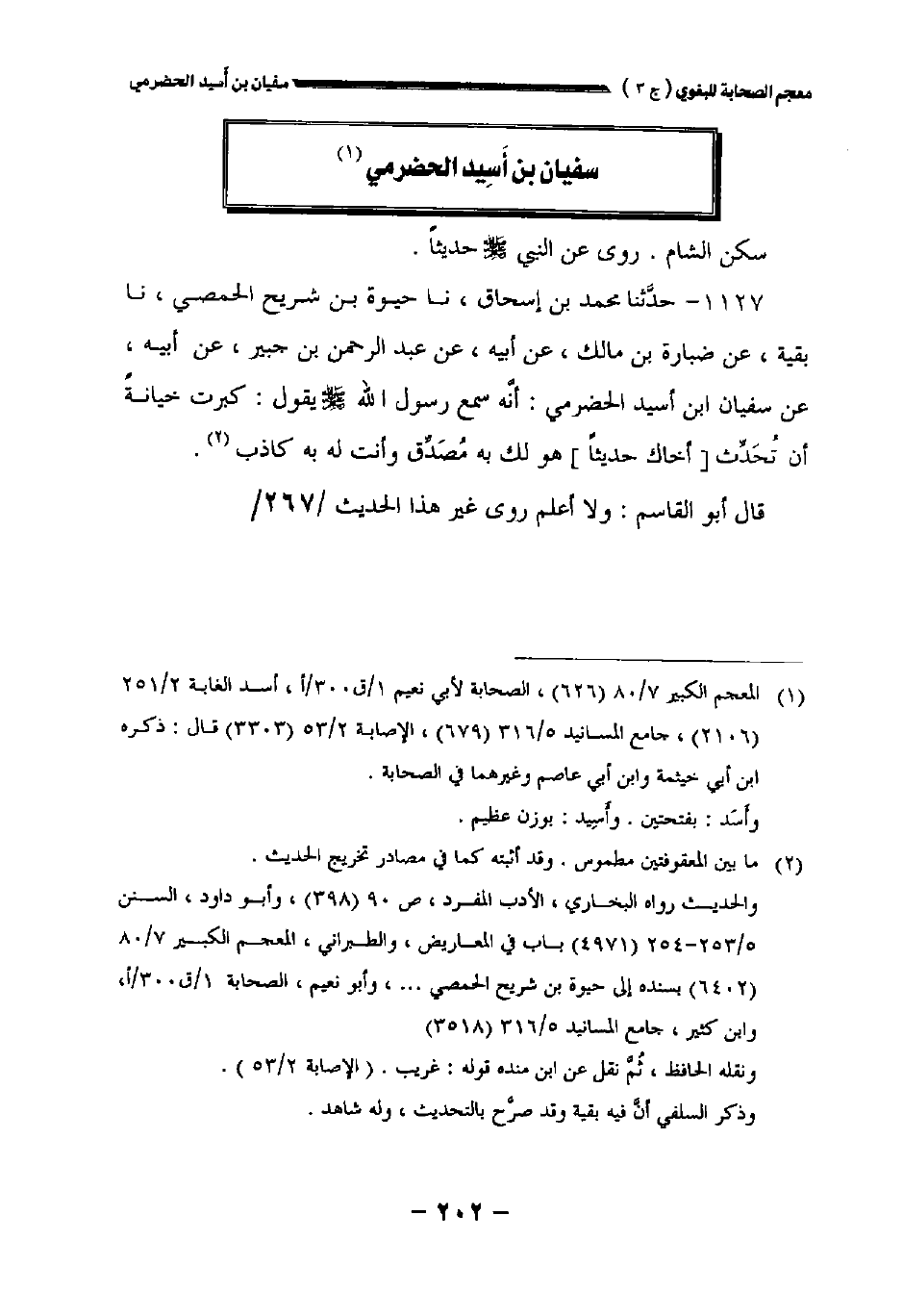 ١١٢٧ - حدثنا محمد بن إسحاق نا حيوة بن شريح الحمصي نا بقية عن ضبارة بن مالك عن أبيه عن عبد الرحمن بن جبير عن أبيه عن سفيان بن أسيد الحضرمي: أنه سمع رسول الله صلى الله عليه وسلم يقول: كبرت خيانة أن تحدث [أخاك حديثا] هو لك به مصدق وأنت له به كاذب.
