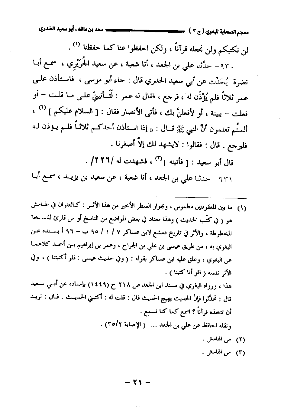 ٩٣٠ - حدثنا علي بن الجعد أنا شعبة عن سعيد الجريري سمع أبا نضرة يحدث عن أبي سعيد الخدري قال: جاء أبو موسى، فاستأذن على عمر ثلاثا فلم يؤذن له فرجع فقال له عمر: لتأتيني على ما قلت أو فعلت ببينة أو لأفعلن بك فأتى الأنصار فقال: [السلام عليكم]، ألستم تعلمون أن النبي صلى الله عليه وسلم قال: " إذا استأذن أحدكم ثلاثا فلم يؤذن له فليرجع. قال: فقالوا: لا يشهد لك إلا أصغرنا.