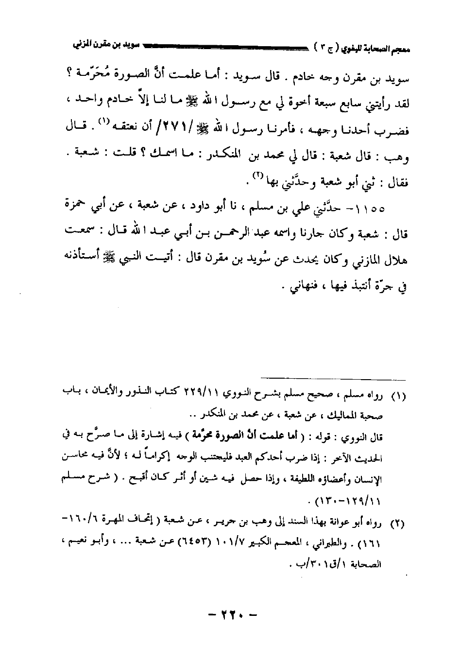 سويد بن مقرن وجه خادم. قال سويد: أما علمت أن الصورة محرمة؟ لقد رأيتني سابع سبعة أخوة لي مع رسول الله صلى الله عليه وسلم ما لنا إلا خادم واحد، فضرب أحدنا وجهه فأمرنا رسول الله صلى الله عليه وسلم //٢٧١//أن نعتقه. قال وهب: قال شعبة: قال لي محمد بن المنكدر: ما اسمك؟ قلت: شعبة. فقال: ثني أبو شعبة وحدثني بها.