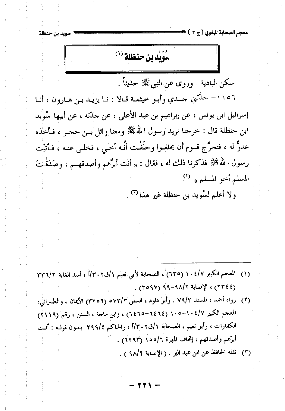 ١١٥٦ - حدثني جدي وأبو خيثمة قالا: نا يزيد بن هارون أنا إسرائيل بن يونس عن إبراهيم بن عبد الأعلى عن جدته عن أبيها سويد بن حنظلة قال: خرجنا نريد رسول الله صلى الله عليه وسلم ومعنا وائل بن حجر فأخذه عدو له فتحرج قوم أن يحلفوا وحلفت أنه أخي فخلى عنه فأتيت رسول الله صلى الله عليه وسلم فذكرنا ذلك له فقال: " أنت أبرهم وأصدقهم وصدقت المسلم أخو المسلم.