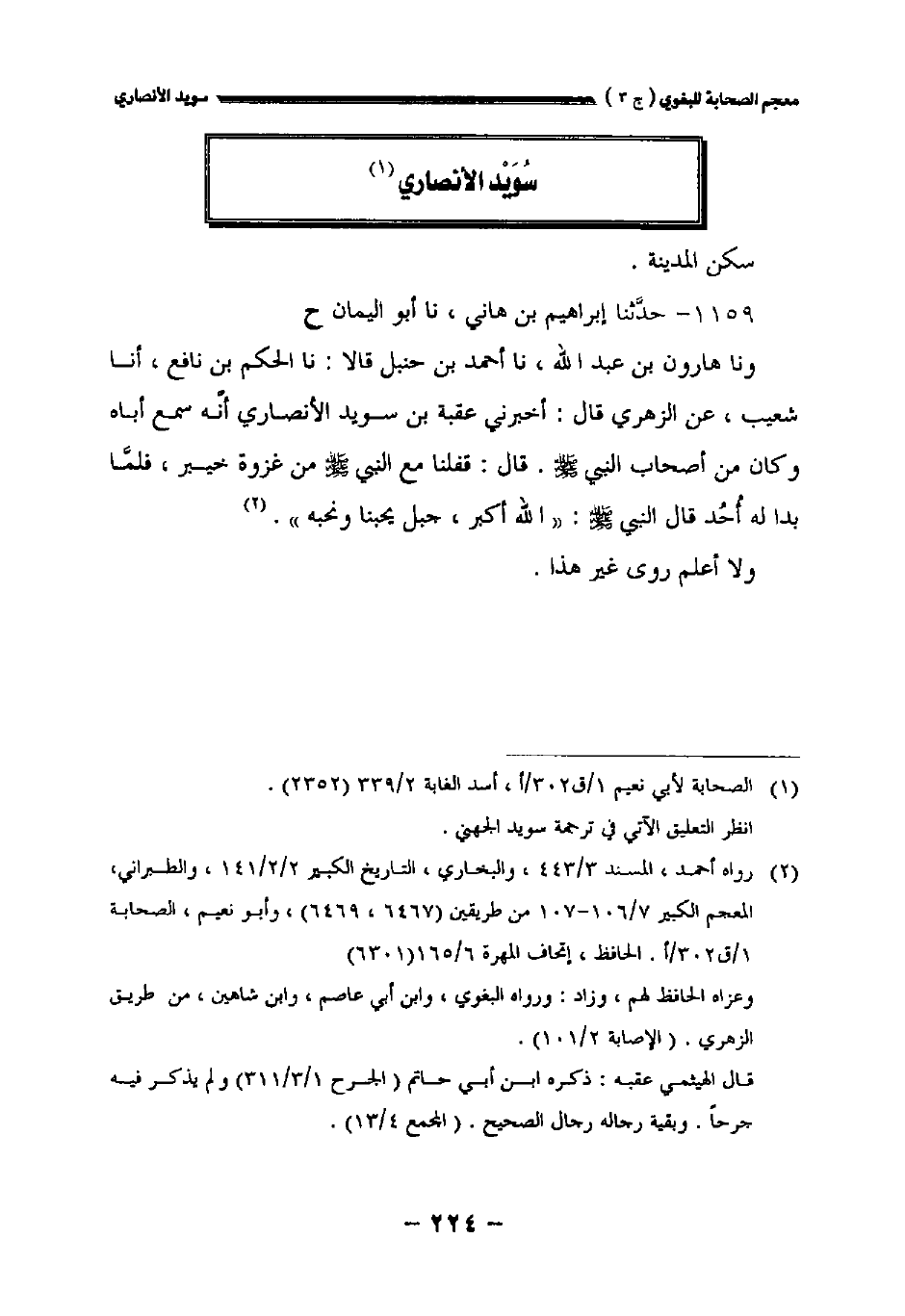 ونا هارون بن عبد الله نا أحمد بن حنبل قالا: نا الحكم بن نافع أنا شعيب عن الزهري قال: أخبرني عقبة بن سويد الأنصاري أنه سمع أباه وكان من اصحاب النبي صلى الله عليه وسلم. قال: قفلنا مع النبي صلى الله عليه وسلم من غزوة خيبر فلما بدا له أحد قال النبي صلى الله عليه وسلم: " الله أكبر جبل يحبنا ونحبه.