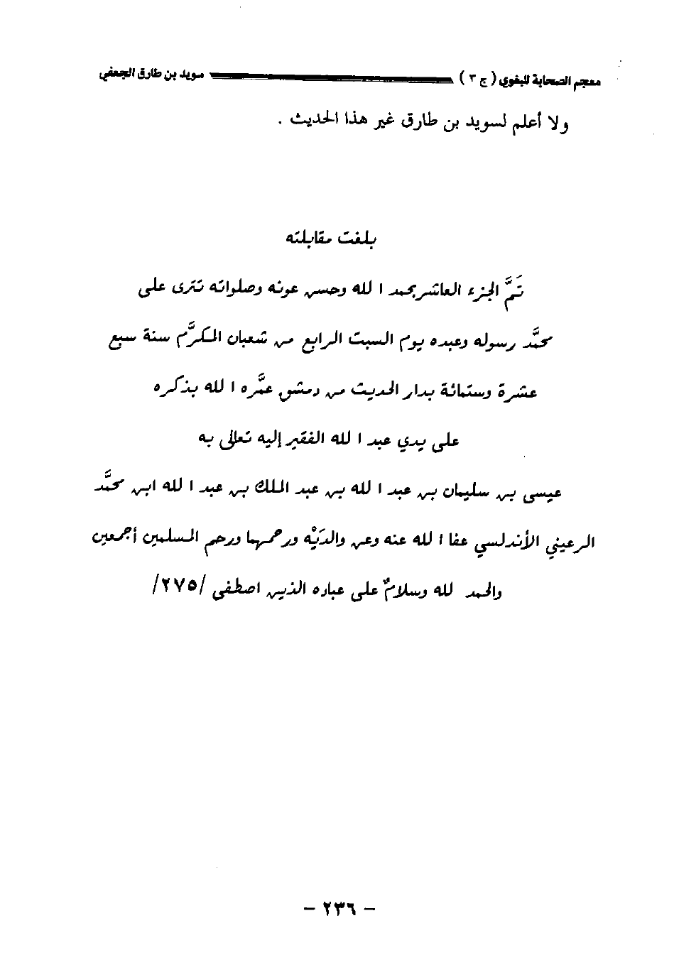 على يد الفقير إليه، تعالى، به. عيسى بن سليمان بن عبد الله بن عبد الملك بن عبد الله بن محمد الرعيني الأندلسي، عفى الله عنه، وعن والديه، ورحمهما، ورحم المسلمين أجمعين، والحمد لله، وسلام على عباده الذين اصطفى //٢٧٥//