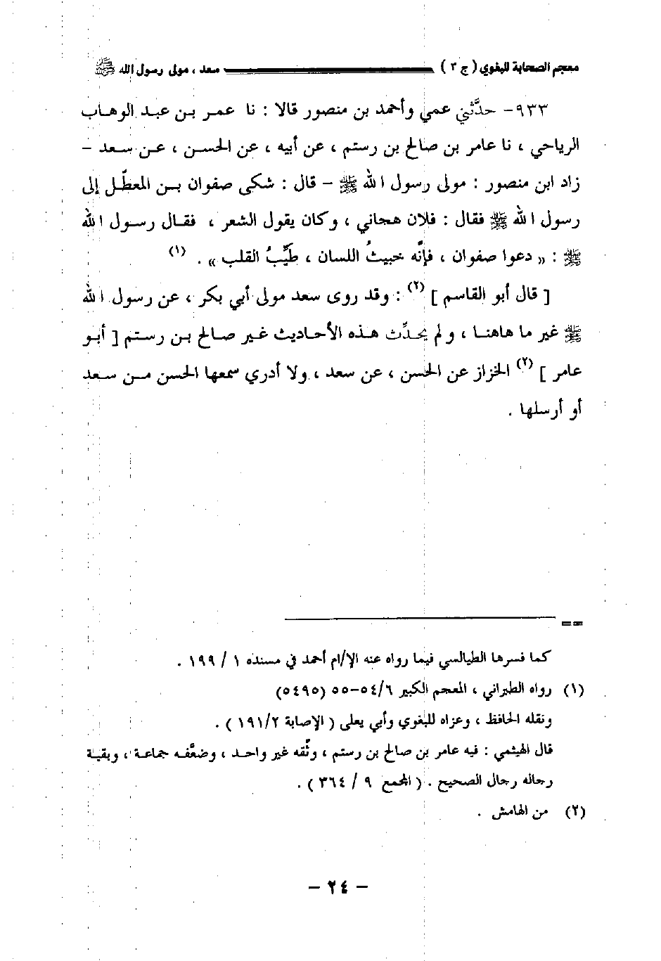 ٩٣٣ - حدثني عمي وأحمد بن منصور قالا: نا عمر بن عبد الوهاب الرياحي نا عامر بن صالح بن رستم عن أبيه عن الحسن عن سعد زاد ابن منصور: مولى رسول الله صلى الله عليه وسلم قال: شكى صفوان بن المعطل إلى رسول الله صلى الله عليه وسلم فقال: فلان هجاني وكان يقول الشعر، فقال رسول الله صلى الله عليه وسلم: " دعوا صفوان فإنه خبيث اللسان طيب القلب.