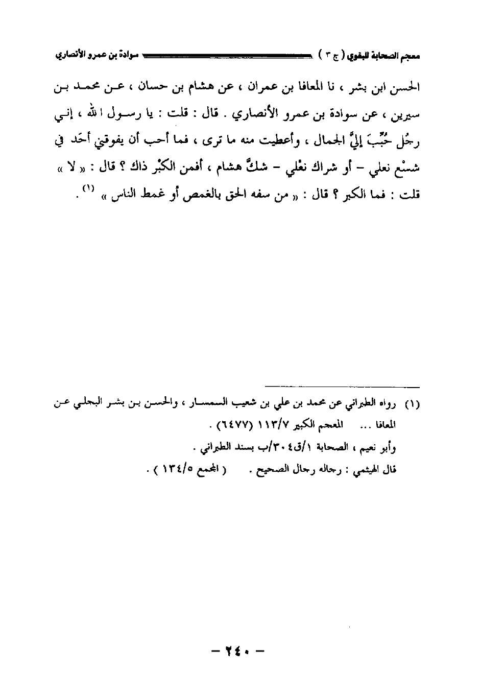 الحسن بن بشر نا المعافا بن عمران عن هشام بن حسان عن محمد بن سيرين عن سوادة بن عمرو الأنصاري قال: قلت: يارسول الله إني رجل حبب إلي الجمال وأعطيت منه ما ترى فما أحب أن يفوقني أحد في شسع نعلي - أو شراك نعلي - شك هشام أفمن الكبر ذاك؟ قال: " لا " قلت: فما الكبر؟ قال: " من سفه الحق بالغمص أو غمط الناس.