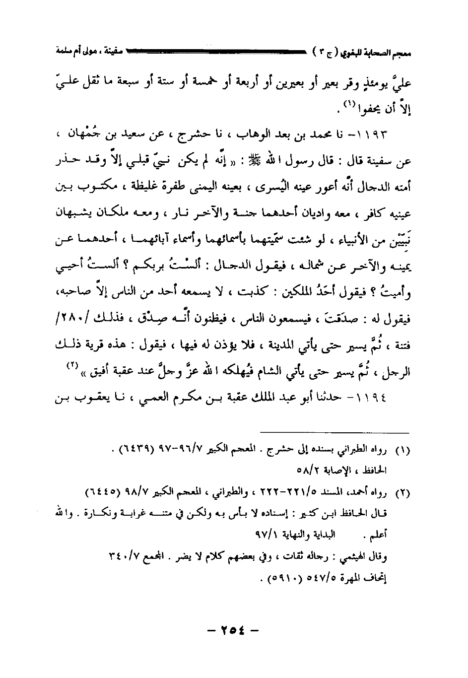 ١١٩٣ - نا محمد بن عبد الوهاب نا حشرج عن سعيد بن جمهان عن سفينة قال: قال رسول الله صلى الله عليه وسلم: " إنه لم يكن نبي قبلي إلا وقد حذر أمته الدجال أنه أعور عينه اليسرى بعينه اليمنى طفرة غليظة مكتوب بين عينيه كافر معه واديان أحدهما جنة والآخر نار ومعه ملكان يشبهان نبيين من الأنبياء لو شئت سميتهما بأسمائهما وأسماء آبائهما أحدهما عن يمينه والآخر عن شماله فيقول الدجال: ألست بربكم؟ ألست أحيي وأميت؟ فيقول أحد الملكين: كذبت لا يسمعه أحد من الناس إلا صاحبه فيقول له: صدقت فيسمعون الناس فيظنون أنه صدق فذلك //٢٨٠// فتنة ثم يسير حتى يأتي المدينة فلا يؤذن له فيها فيقول: هذه قرية ذلك الرجل ثم يسير حتى يأتي الشام فيهلكه الله عز وجل عند عقبة أفيق.