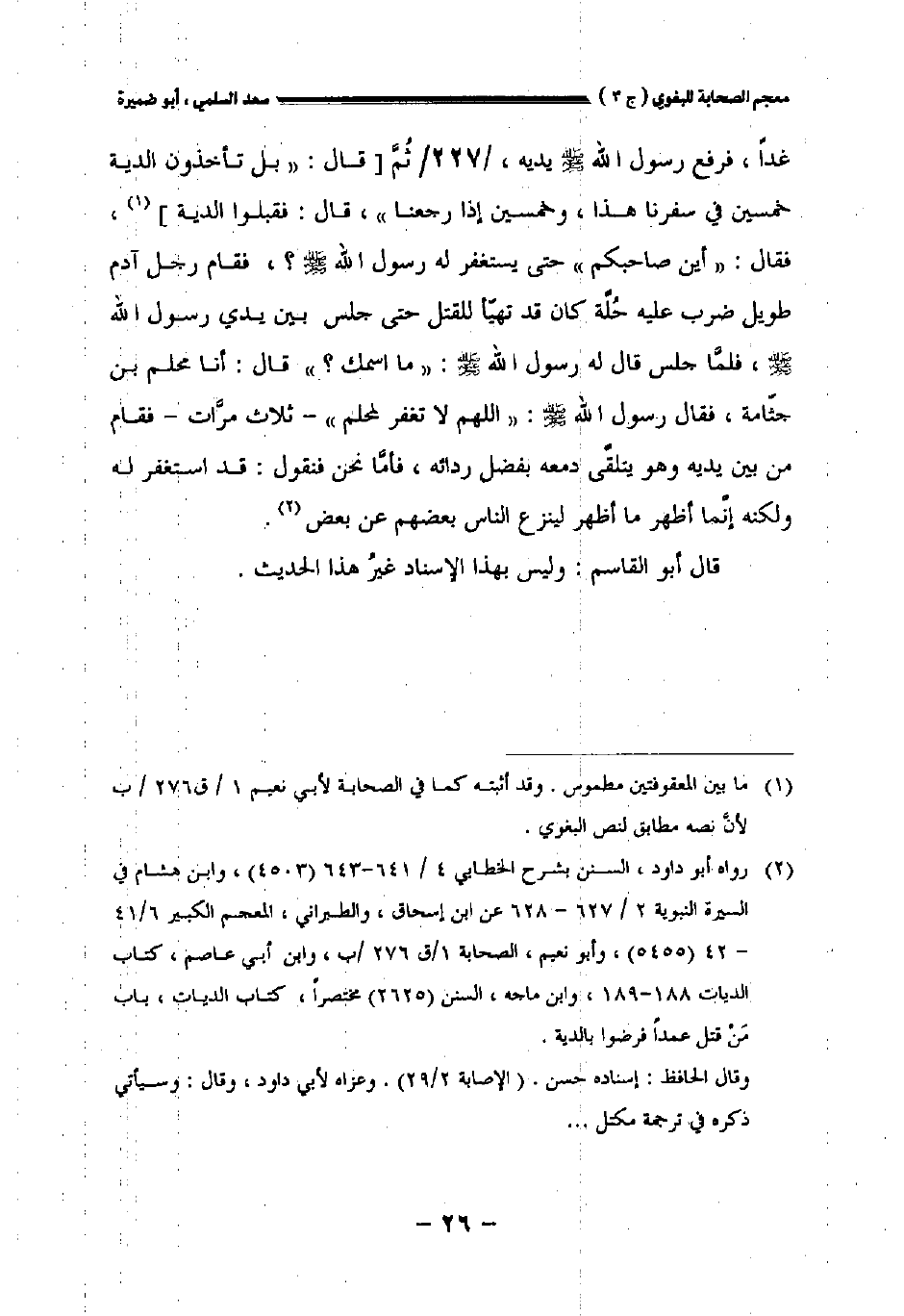 غدل، فرفع رسول الله صلى الله عليه وسلم يديه //٢٢٧//ثم [قال: " بل تأخذون الدية خمسين في سفرنا هذا وخمسين إذا رجعنا " قال: فقبلوا الدية]، فقال: " أين صاحبكم " حتى يستغفر له رسول الله صلى الله عليه وسلم؟ فقام رجل آدم طويل ضرب عليه حلة كان قد تهيأ للقتل حتى جلس بين يدي رسول الله صلى الله عليه وسلم فلما جلس قال له رسول الله صلى الله عليه وسلم:" ما اسمك؟ " قال: أنا محلم بن جثامة فقال رسول الله صلى الله عليه وسلم: " اللهم لا تغفر لمحلم " ثلاث مرات، فقام من بيد يديه وهو يتلقى دمعه بفضل ردائه فأما نحن فنقول: قد استغفر له ولكنه إنما أظهر لينزع الناس بعضهم عن بعض.