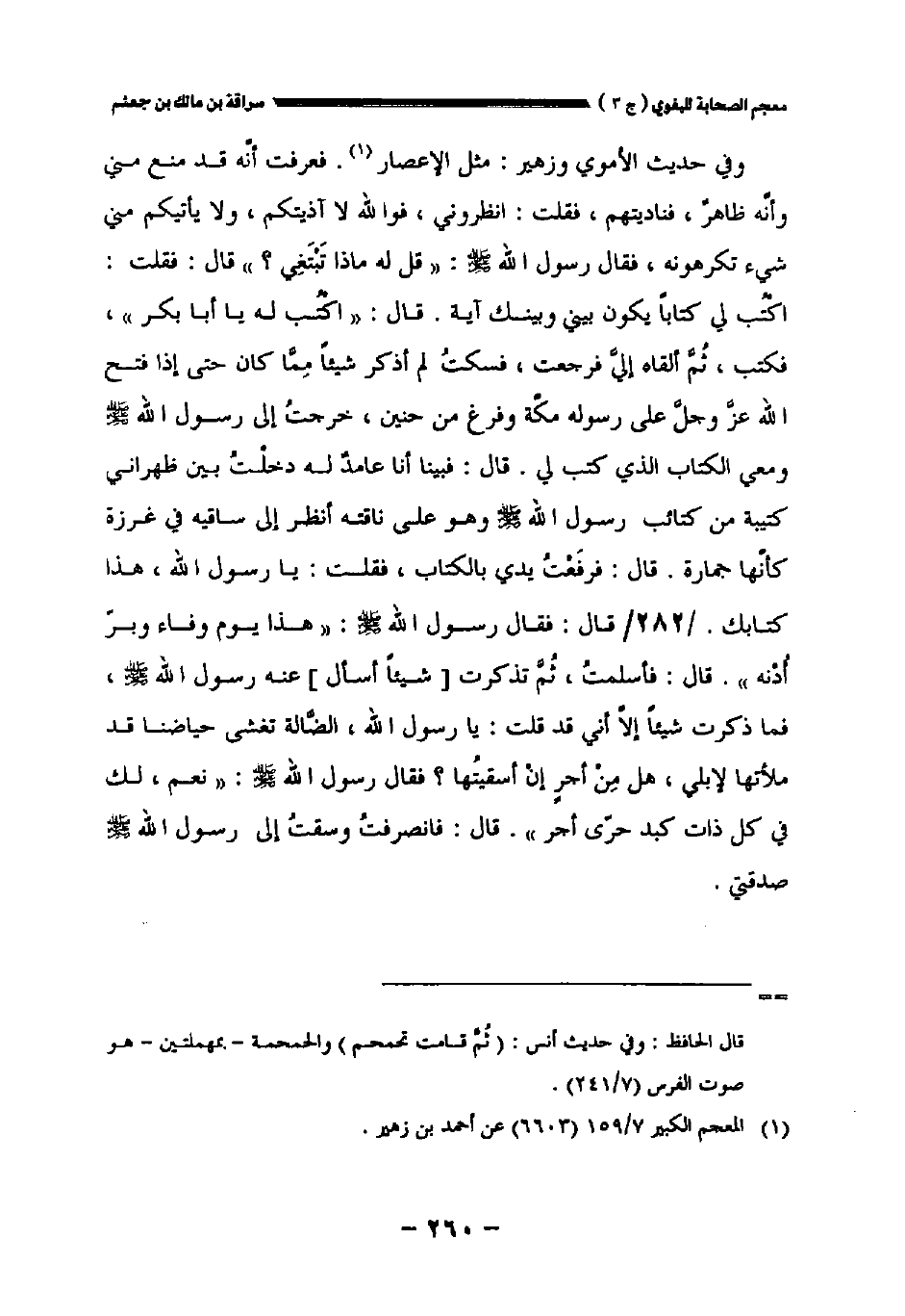 وفي حديث الأموي وزهير: مثل الإعصار، فعرفت أنه قد منع مني , وأنه ظاهر، فناديتهم فقلت: أنظروني , فوالله لا آذيتكم , ولا يأتيكم مني شيء تكرهونه، فقال رسول الله صلى الله عليه وسلم: قل له: ماذا تبتغي؟ قال: فقلت: اكتب لي كتابا يكون بيني وبينك آية، قال: اكتب له يا أبا بكر، فكتب، ثم ألقاها إلي، فرجعت، فسكت , لم أذكر شيئا مما كان , حتى إذا فتح الله عز وجل على رسوله مكة، وفرغ من أهل حنين خرجت إلى رسول الله صلى الله عليه وسلم، ومعي الكتاب الذي كتب لي , قال: فبينا أنا عامد له , دخلت بين ظهراني كتيبة من كتائب رسول الله صلى الله عليه وسلم وهو على ناقته أنظر إلى ساقيه في غرزة كأنها جمارة، قال: فرفعت يدي بالكتاب، فقلت: يا رسول الله، هذا كتابك؟ //٢٨٢// قال: فقال رسول الله صلى الله عليه وسلم: هذا يوم وفاء وبر، ادنه.