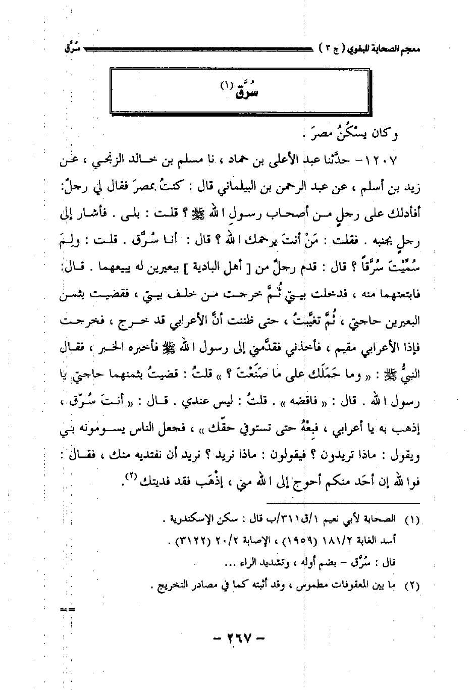 ١٢٠٧ - حدثنا عبد الأعلى بن حماد نا مسلم بن خالد الزنجي عن زيد بن أسلم عن عبد الرحمن بن البيلماني قال: كنت بمصر فقال لي رجل: أفأدلك على رجل من أصحاب رسول الله صلى الله عليه وسلم؟ قلت: بلى. فأشار إلى رجل بجنبه. فقلت: من أنت يرحمك الله؟ قال: أنا سرق. قلت: ولم سميت سرقا؟ قال: قدم رجل من [أهل البادية] ببعيرين له يبيعهما. قال: فابتعتهما منه فدخلت بيتي ثم خرجت من خلف بيتي فقضيت بثمن البعيرين حاجتي ثم تغيبت حتى ظننت أن الأعرابي قد خرج فخرجت فإذا الأعرابي مقيم فأخذني فقدمني إلى رسول الله صلى الله عليه وسلم فأخبره الخبر فقال النبي صلى الله عليه وسلم: " وما حملك على ما صنعت؟ " قلت: قضيت بثمنهما حاجتي يارسول الله. قال: " فاقضه ". قلت: ليس عندي. قال: " أنت سرق اذهب به ياأعرابي فبعه حتى تستوفي حقك " فجعل الناس يسومونه بي يقول: ماذا تريدون؟ فيقولون: ماذا نريد؟ نريد أن نفتديه منك، فقال: والله إن أحد منكم أحوج إلى الله مني اذهب فقد فديتك.