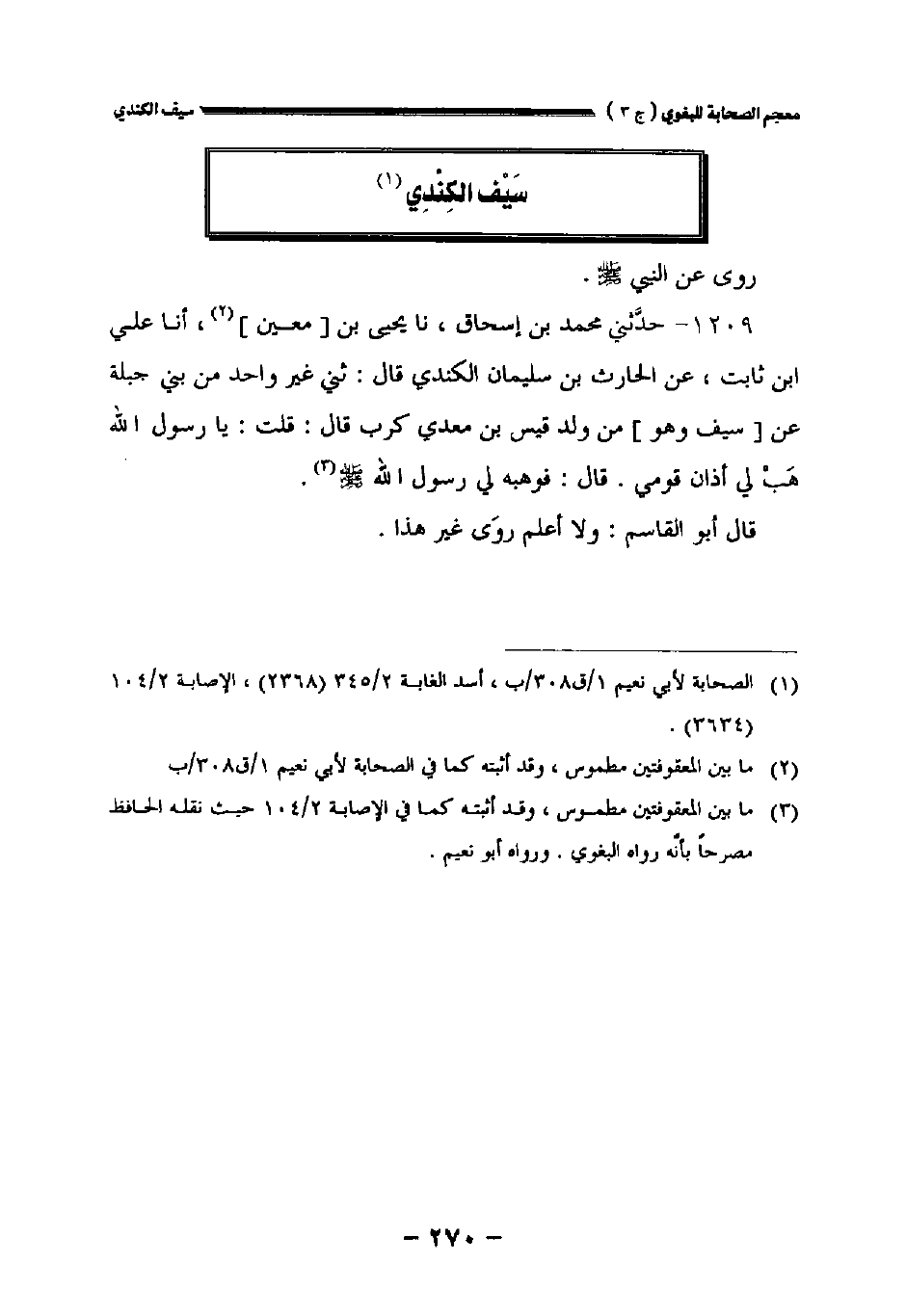 ١٢٠٩ - حدثني محمد بن إسحاق نا يحيى بن [معين] أخبرنا علي بن ثابت عن الحارث بن سليمان الكندي قال: حدثني غير واحد من بني جبلة عن [سيف وهو] من ولد قيس بن معدي كرب قال: قلت: يارسول الله هب لي أذان قومي. قال: فوهبه لي رسول الله صلى الله عليه وسلم.