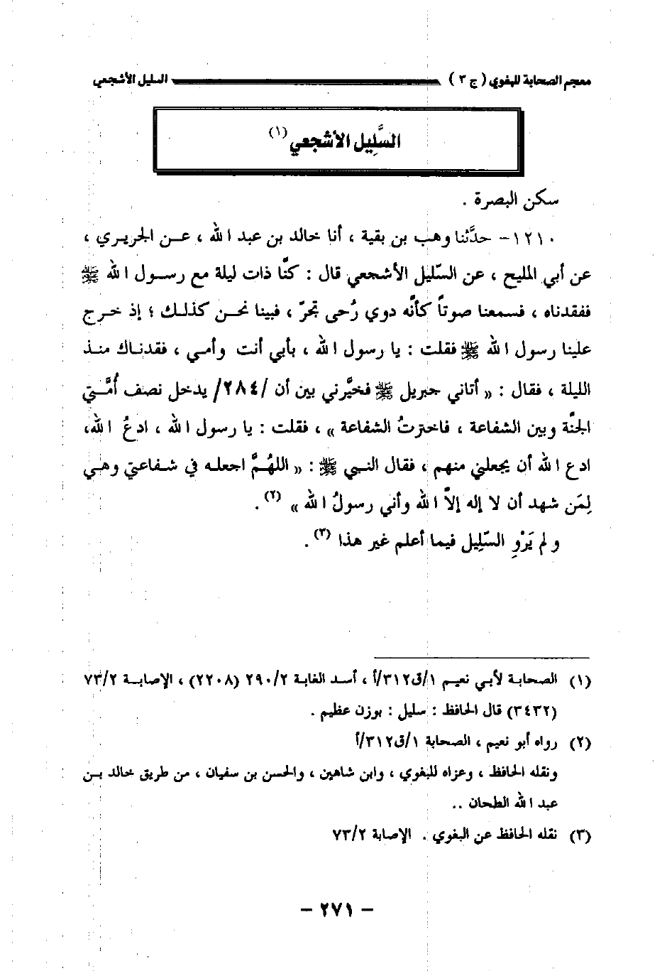 ١٢١٠ - حدثنا وهب بن بقية أنا خالد بن عبد الله عن الجريري عن أبي المليح عن السليل الأشجعي قال: كنا ذات ليلة مع رسول الله صلى الله عليه وسلم ففقدناه فسمعنا صوتا كأنه دوي رحى تجر فبينا نحن كذلك إذ خرج علينا رسول الله صلى الله عليه وسلم فقلت: يارسول الله بأبي أنت وأمي فقدناك منذ الليلة، فقال: " أتاني جبريل صلى الله عليه وسلم فخيرني بين أن //٢٨٤//يدخل نصف أمتي الجنة وبين الشفاعة فاخترت الشفاعة " فقلت: يارسول الله ادع الله ادع الله أن يجعلني منهم فقال النبي صلى الله عليه وسلم: " اللهم اجعله في شفاعتي وهي لمن شهد أن لا إله إلا الله وأني رسول الله.