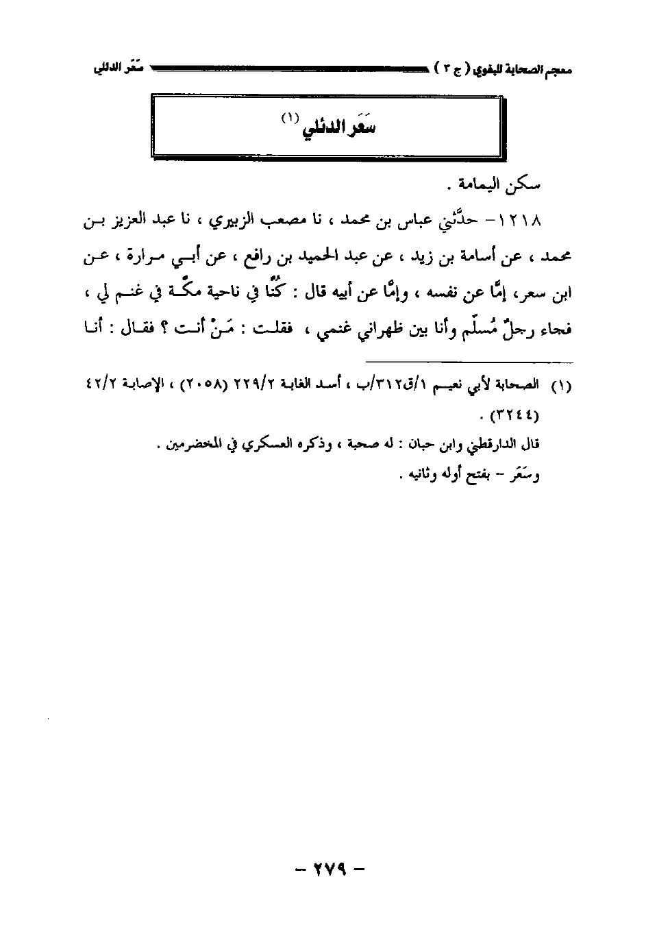 ١٢١٨ - حدثني عباس بن محمد نا مصعب الزبيري نا عبد العزيز بن محمد عن أسامة بن زيد عن عبد الحميد بن رافع عن أبي مرارة عن ابن سعر إما عن نفسه وإما عن أبيه قال: كنا في ناحية مكة في غنم لي فجاء رجل مسلم، وأنا بين ظهراني غنمي فقلت: من أنت؟ فقال: أنا