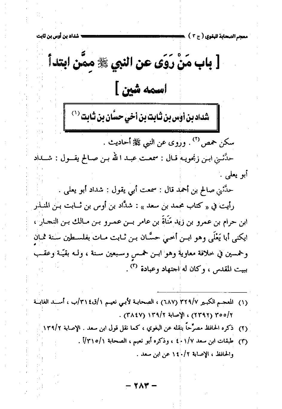 رأيت في " كتاب محمد بن سعد ": شداد بن أوس بن ثابت بن المنذر بن حرام بن عمرو بن زيد مناة بن عامر بن عمرو بن مالك بن النجار يكنى أبا يعلى وهو ابن أخي حسان بن ثابت مات بفلسطين سنة ثمان وخمسين في خلافة معاوية وهو ابن خمس وسبعين سنة وله بقية وعقب ببيت المقدس وكان له اجتهاد وعبادة.