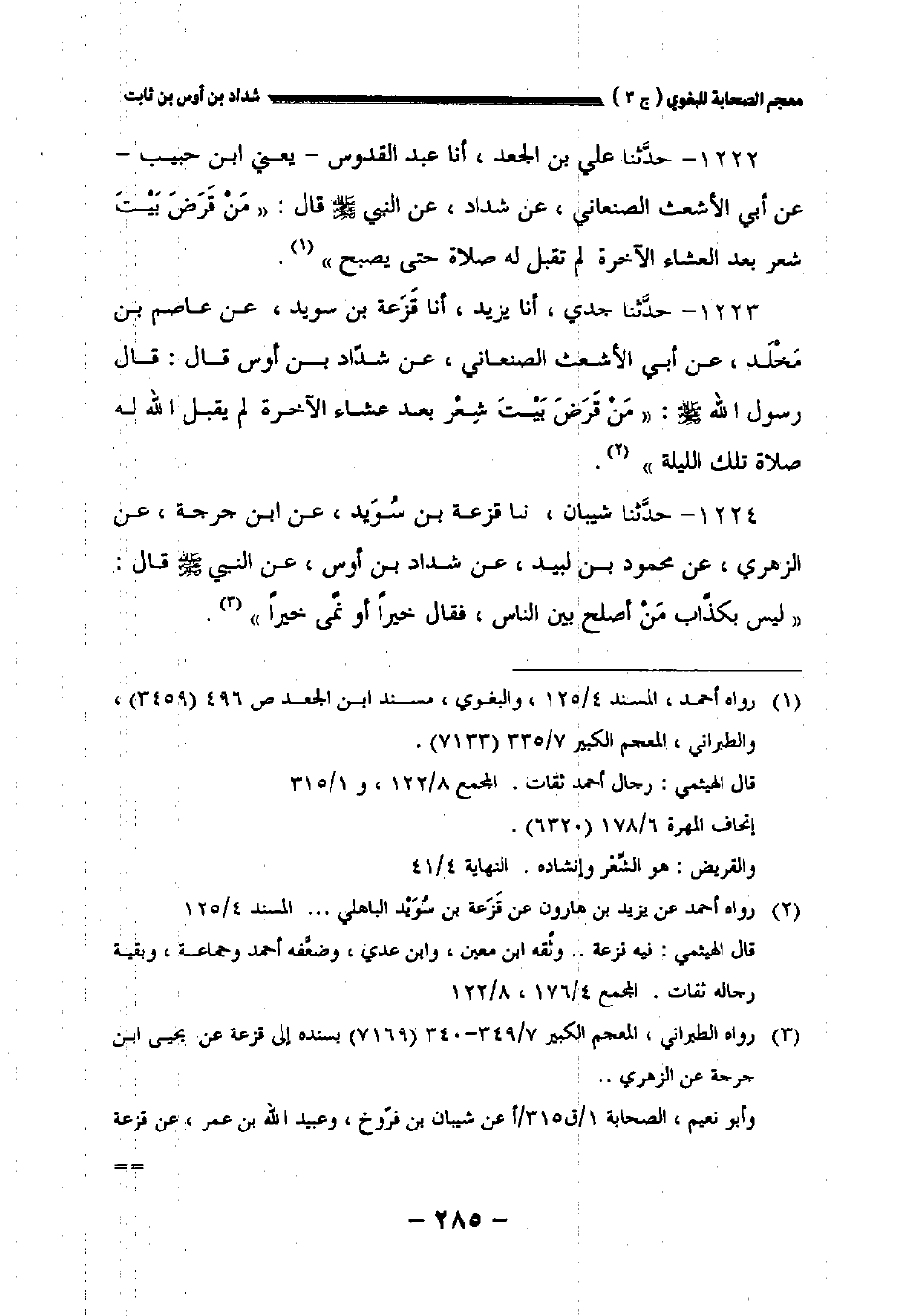 ١٢٢٢ - حدثنا علي بن الجعد أخبرنا عبد القدوس يعني ابن حبيب عن أبي الأشعث الصنعاني عن شداد، عن النبي صلى الله عليه وسلم قال: " من قرض بيت شعر بعد العشاء الآخرة لم تقبل له صلاة حتى يصبح.