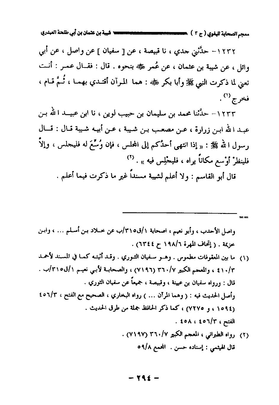 ١٢٣٣ - حدثنا محمد بن سليمان بن حبيب لوين نا ابن عبيد الله بن عبد الله بن زرارة عن مصعب بن شيبة عن أبيه شيبة قال: قال رسول الله صلى الله عليه وسلم: " إذا انتهى أحدكم إلى المجلس فإن وسع له فليجلس وإلا فلينظر أوسع مكانا يراه فليجلس فيه ".