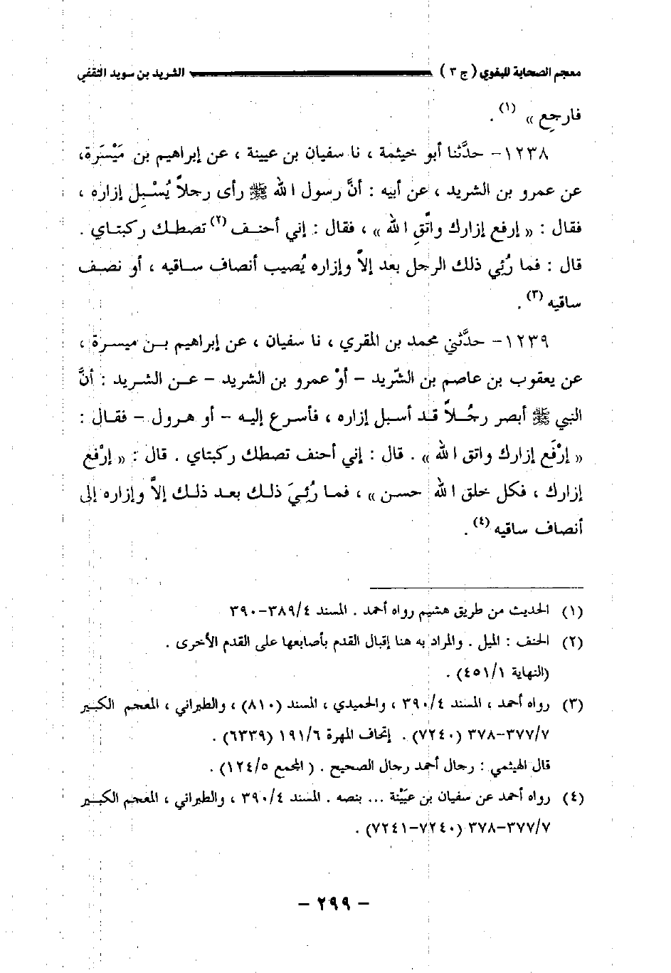 ١٢٣٨ - حدثنا أبو خيثمة نا سفيان بن عيينة عن إبراهيم بن ميسرة عن عمرو بن الشريد عن أبيه: أن رسول الله صلى الله عليه وسلم رأى رجلا يسبل إزاره فقال: " ارفع إزارك واتق الله " فقال: إني أحنف تصطك ركبتاي.