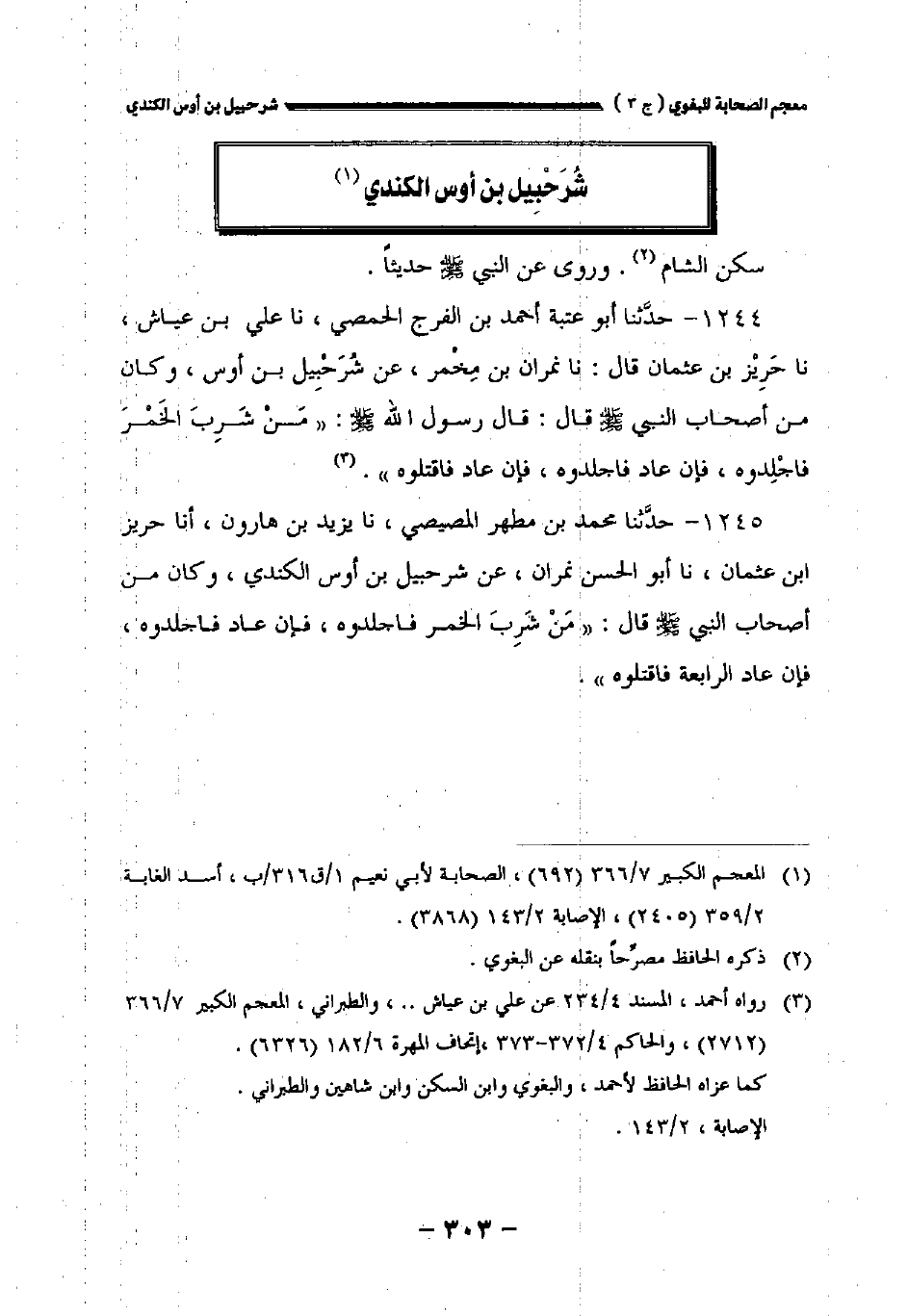 ١٢٤٤ - حدثنا أبو عتبة أحمد بن الفرج الحمصي نا علي بن عياش نا حريز بن عثمان قال: نا نمران بن مخمر عن شرحبيل بن أوس وكان من أصحاب النبي صلى الله عليه وسلم قال: قال رسول الله صلى الله عليه وسلم: " من شرب الخمر فاجلدوه فإن عاد فاجلدوه فإن عاد فاقتلوه ".