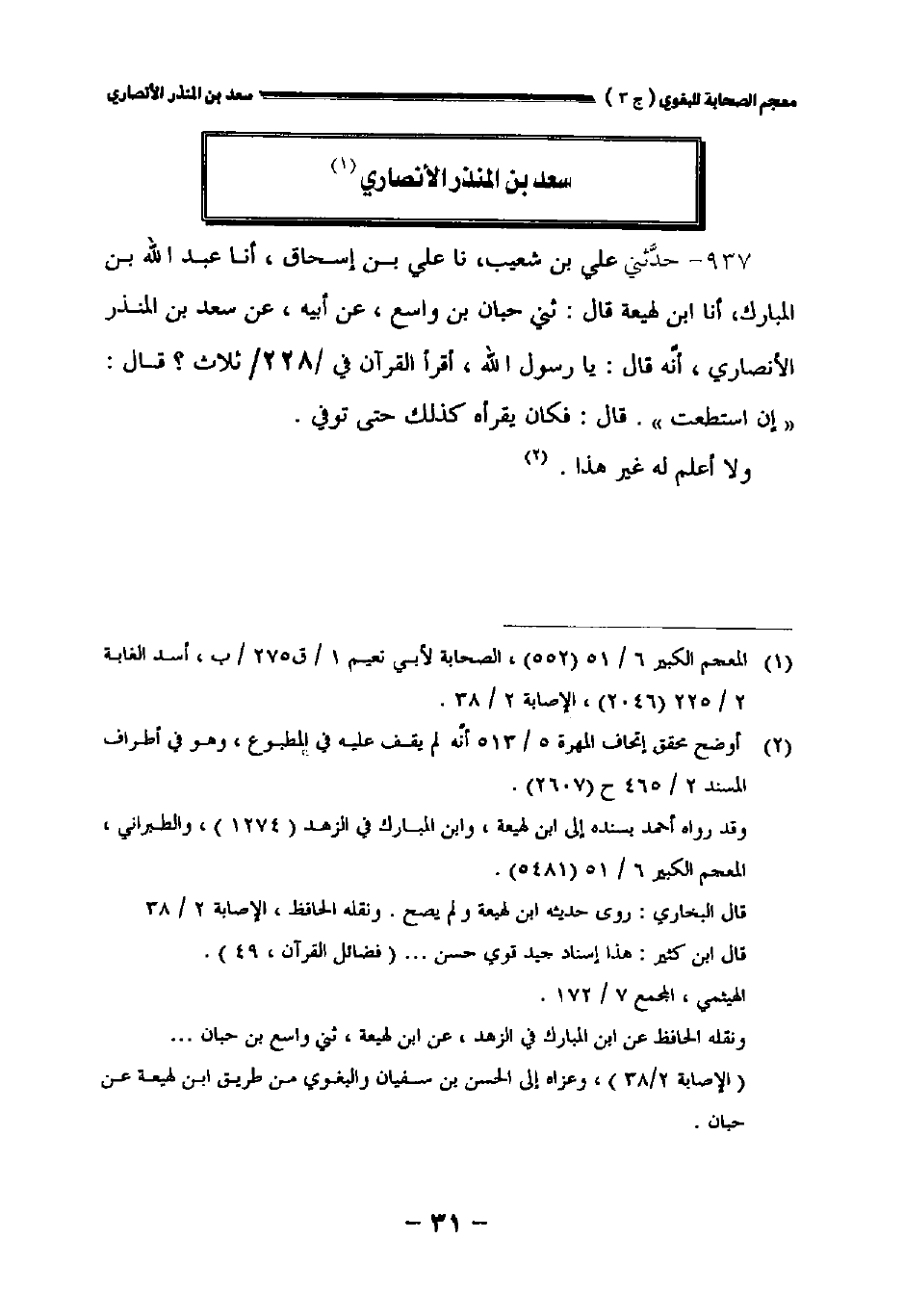 ٩٣٧ - حدثني علي بن شعيب نا علي بن إسحاق أخبرنا عبد الله بن المبارك أنا ابن لهيعة قال: حدثني حبان بن واسع عن أبيه عن سعد بن المنذر الأنصاري أنه قال: يارسول الله أقرأ القرآن في //٢٢٨// ثلاث؟ قال: " إن استطعت ". قال: فكان يقرأه كذلك حتى توفي.