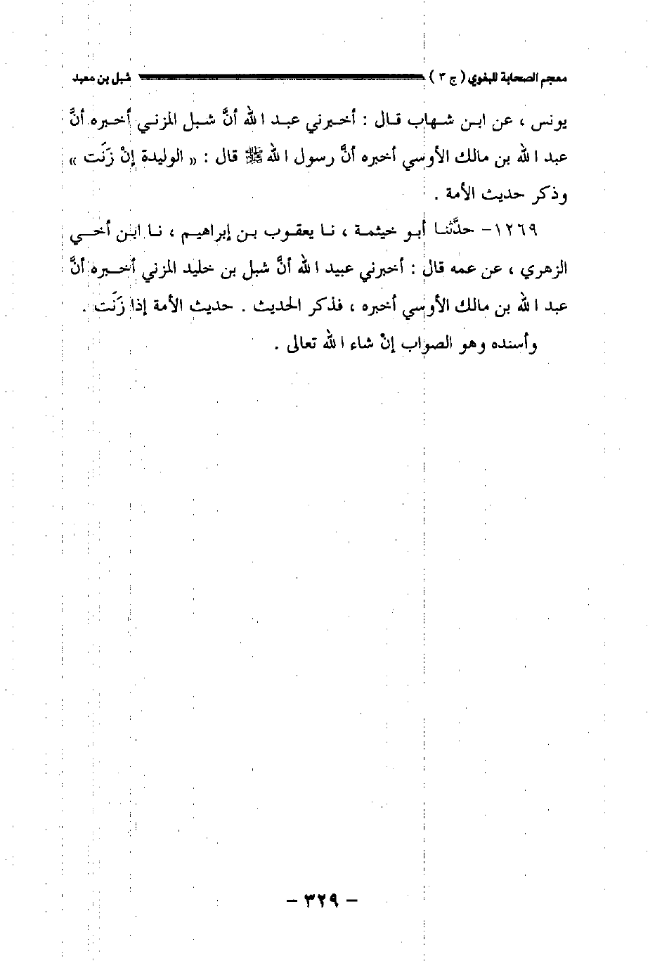 ١٢٦٩ - حدثنا أبو خيثمة نا يعقوب بن إبراهيم نا ابن أخي الزهري عن عمه قال: أخبرني عبيد الله ان شبل بن خليد المزني أخبره أن عبد الله بن مالك الأوسي أخبره فذكر الحديث. حديث الأمة إذا زنت.
