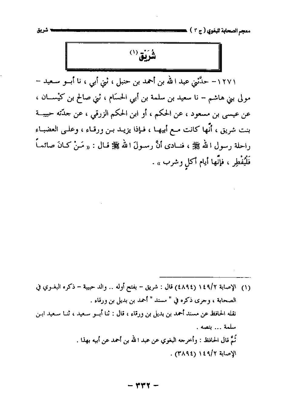 ١٢٧١ - حدثني عبد الله بن أحمد بن حنبل حدثني أبي نا أبو سعيد مولى بني هاشم نا سعيد بن سلمة بن أبي الحسام حدثني صالح بن كيسان عن عيسى بن مسعود عن الحكم أو ابن الحكم الزرقي عن جدته حبيبة بنت شريق أنها كانت مع أبيها فإذا يزيد بن ورقاء وعلى العضباء راحلة رسول الله صلى الله عليه وسلم فنادى أن رسول الله صلى الله عليه وسلم قال: " من كان صائما فليفطر فإنها أيام أكل وشرب.