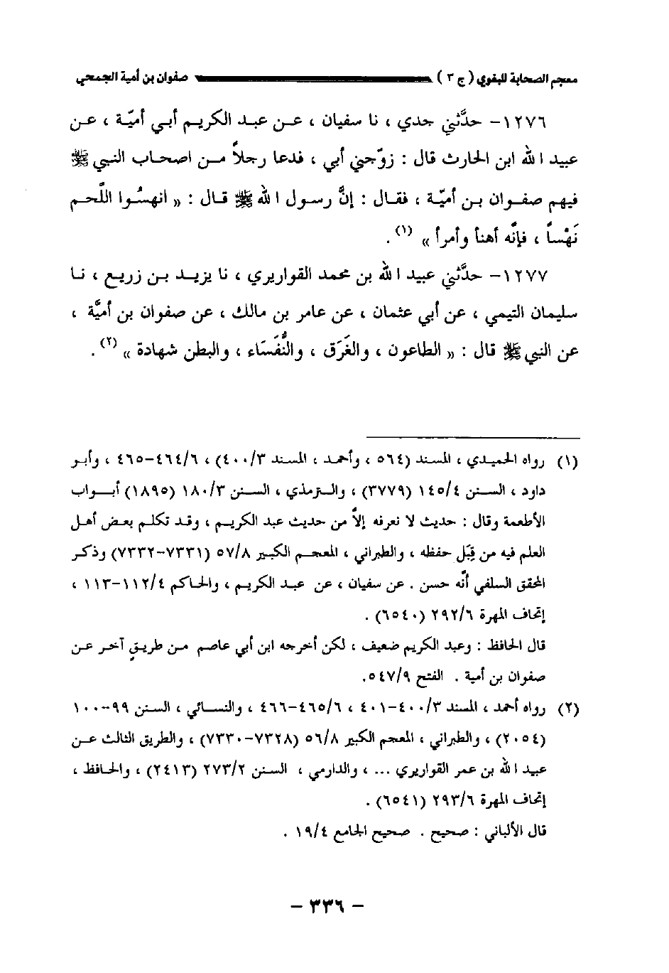 ١٢٧٦ - حدثني جدي نا سفيان عن عبد الكريم أبي أمية عن عبيد الله بن الحارث قال: زوجني أبي فدعا رجلا من أصحاب النبي صلى الله عليه وسلم فيهم صفوان بن أمية فقال: إن رسول الله صلى الله عليه وسلم قال: " انهسوا اللحم نهسا فإنه أهنأ وأمرأ ".