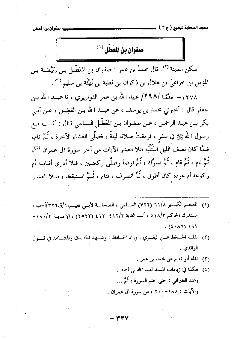 ١٢٧٨ - حدثنا //٢٩٨// عبيد الله بن عمر القواريري نا عبد الله بن جعفر قال: أخبرني محمد بن يوسف عن عبد الله بن الفضل عن أبي بكر بن عبد الرحمن عن صفوان بن المعطل السلمي قال: كنت مع رسول الله صلى الله عليه وسلم في سفر فرمقت صلاته ليلة فصلى العشاء الآخرة ثم نام فلما كان نصف الليل استنبه فتلا العشر الآيات من آخر سورة آل عمران ثم نام ثم قام ثم تسوك ثم توضأ وصلى ركعتين فلا أدري أقيامه ام ركوعه أم عوده كان أطول ثم انصرف فنام ثم استيقظ فتلا العشر