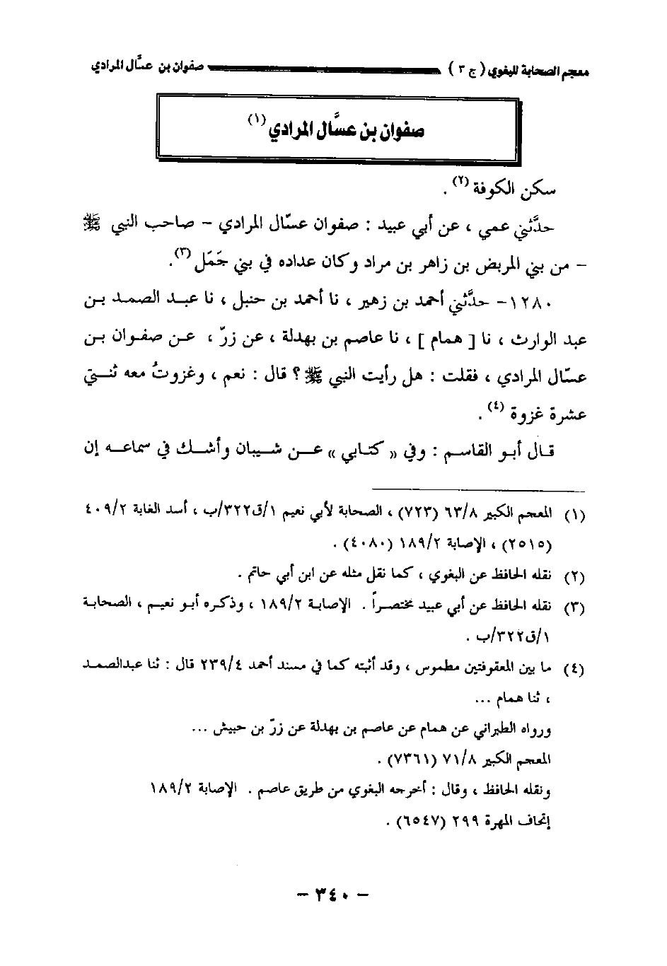 ١٢٨٠ - حدثني أحمد بن زهير نا أحمد بن حنبل نا عبد الصمد بن عبد الوارث نا [همام] نا عاصم بن بهدلة عن زر عن صفوان بن عسال المرادي فقلت: هل رأيت النبي صلى الله عليه وسلم؟ قال: نعم وغزوت معه ثنتي عشرة غزوة.