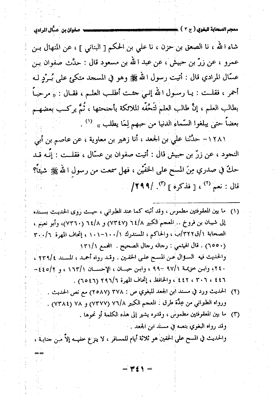١٢٨١ - حدثنا علي بن الجعد أخبرنا زهير بن معاوية عن عاصم بن أبي النجود عن زر بن حبيش قال: أتيت صفوان بن عسال فقلت: إنه قد حك في صدري من المسح على الخفين فهل سمعت من رسول الله صلى الله عليه وسلم شيئا؟ قال: نعم [فذكره].//٢٩٩//