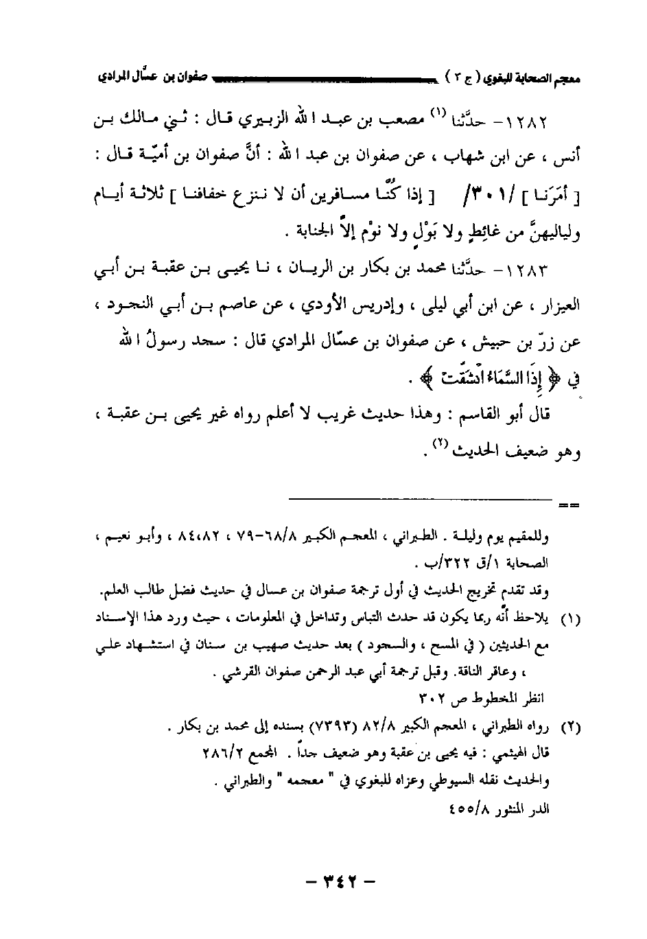 ١٢٨٢ - حدثنا مصعب بن عبد الله الزبيري قال: حدثني مالك بن أنس عن ابن شهاب عن صفوان بن عبد الله: أن صفوان بن أمية قال: [أمرنا] //٣٠٠// [إذا كنا مسافرين أن لا ننزع خفافنا] ثلاثة أيام ولياليهن من غائط ولا بول ولا نوم إلا الجنابة.