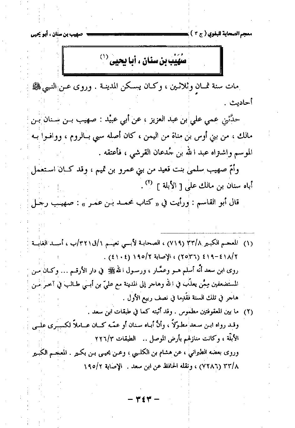 حدثني عمي علي بن عبد العزيز عن أبي عبيد: صهيب بن سنان بن مالك من بني أوس بن مناة من اليمن كان أصله سبي بالروم ووافوا به الموسم واشتراه عبد الله بن جدعان القرشي فأعتقه.