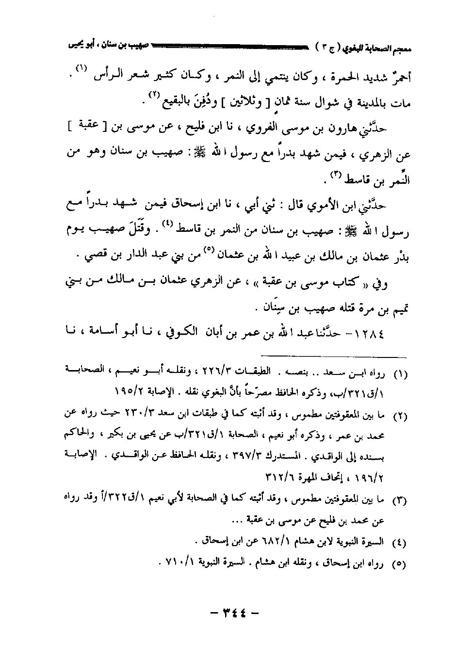 حدثني هارون بن موسى الفروي نا ابن فليح عن موسى بن [عقبة] عن الزهري فيمن شهد بدرا مع رسول الله صلى الله عليه وسلم: صهيب بن سنان وهو من النمر بن قاسط.