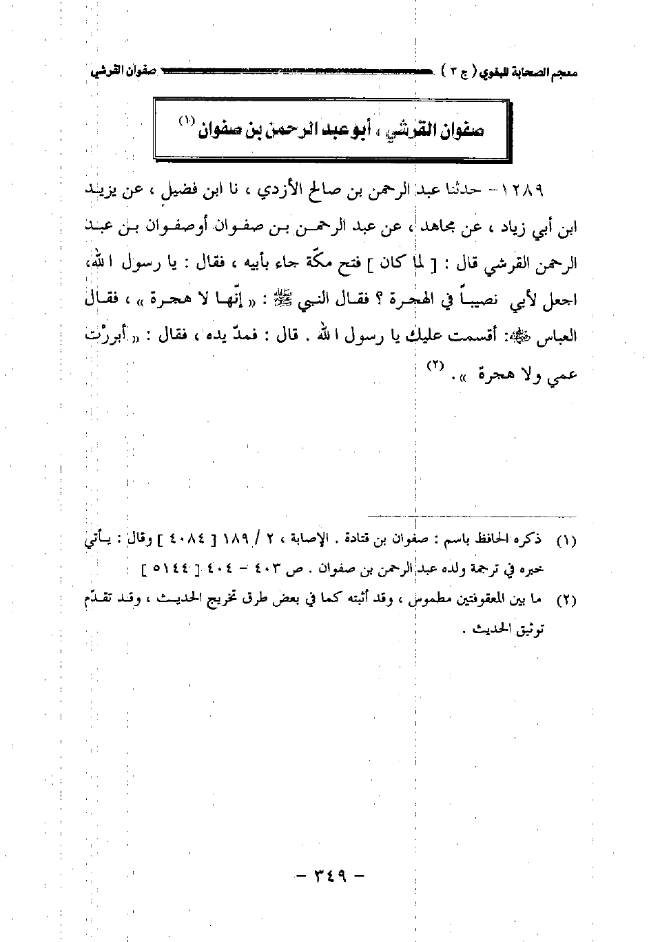 ١٢٨٩ - حدثنا عبد الرحمن بن صالح الأزدي نا ابن فضيل عن يزيد بن أبي زياد عن مجاهد عن عبد الرحمن بن صفوان أو صفوان بن عبد الرحمن القرشي قال: [لما كان] فتح مكة جاء بأبيه فقال: يارسول الله اجعل لأبي نصيبا في الهجرة؟ فقال النبي صلى الله عليه وسلم: " إنها لا هجرة " فقال العباس: أقسمت عليك يارسول الله. قال: فمد يده فقال: " أبررت عمي ولا هجرة.