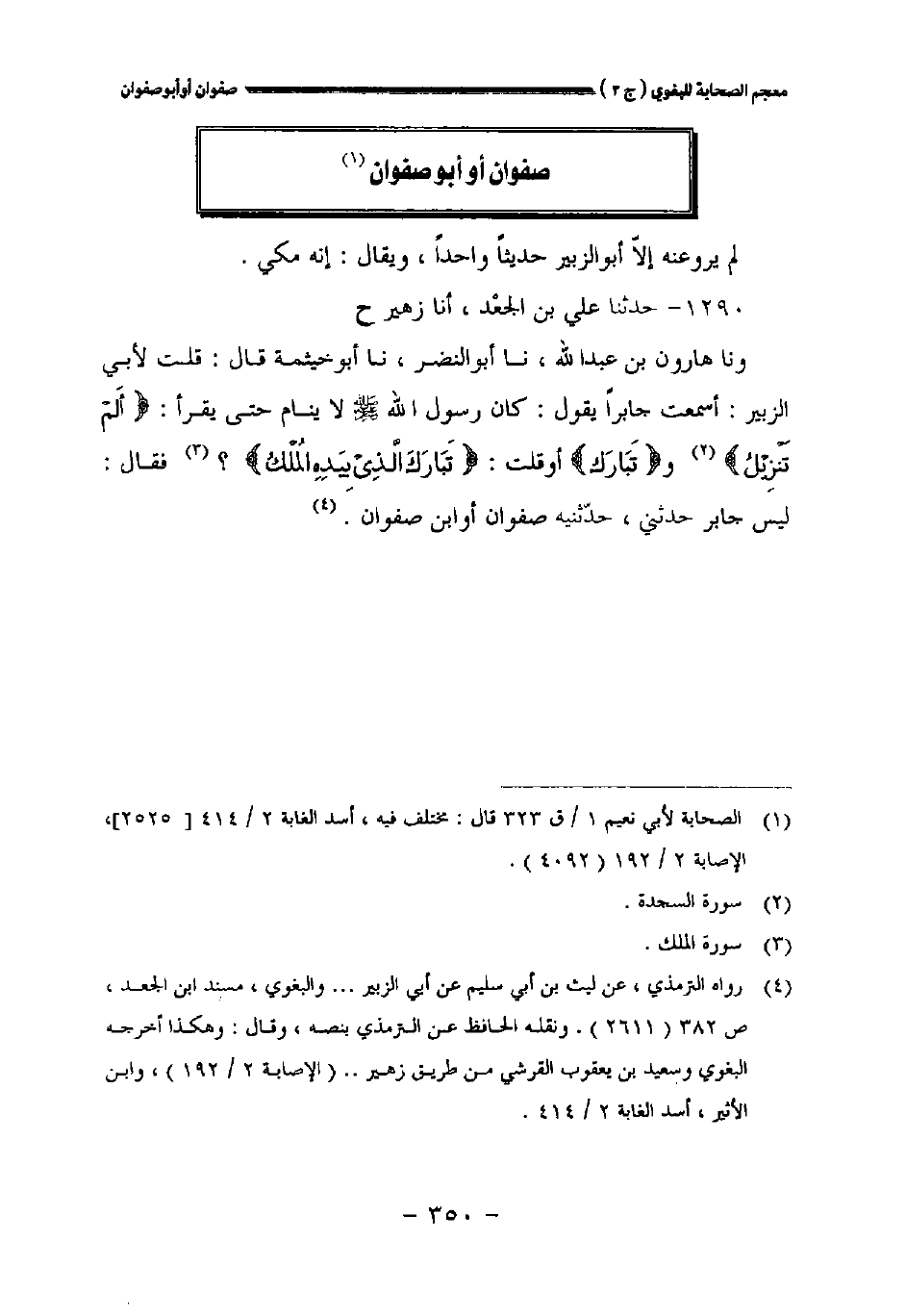 ونا هارون بن عبد الله نا أبو النضر نا أبو خيثمة قال: قلت لأبي الزبير: أسمعت جابرا يقول: كان رسول الله صلى الله عليه وسلم لا ينام حتى يقرأ {ألم تنزيل} و {تبارك} أو قلت {تبارك الذي بيده الملك}؟ فقال: ليس جابر حدثني، حدثني صفوان أو ابن صفوان.