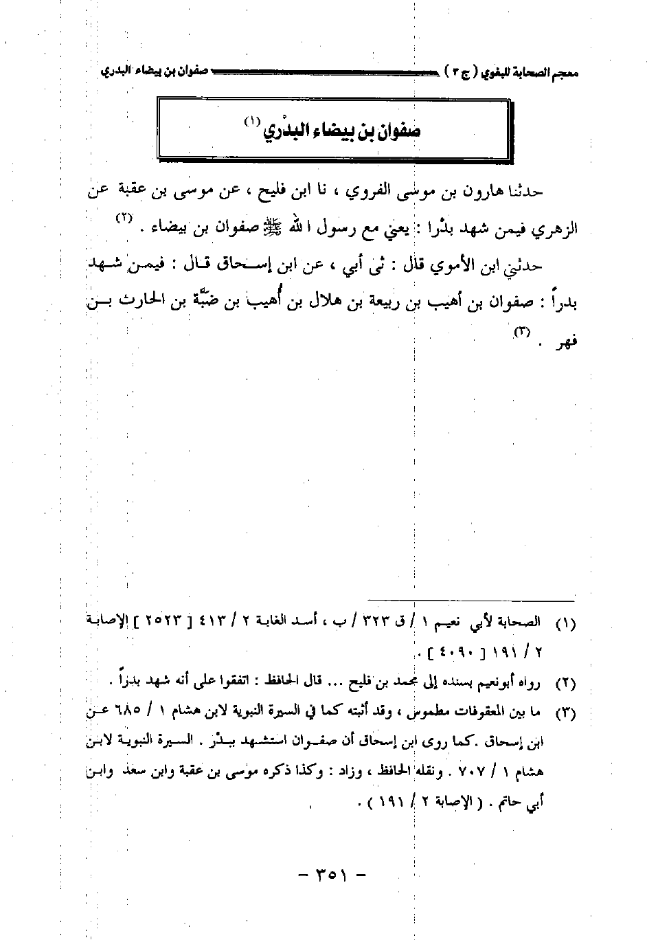حدثنا هارون بن موسى الفروي نا ابن فليح عن موسى بن عقبة عن الزهري فيمن شهد بدرا: يعني مع رسول الله صلى الله عليه وسلم صفوان بن بيضاء.