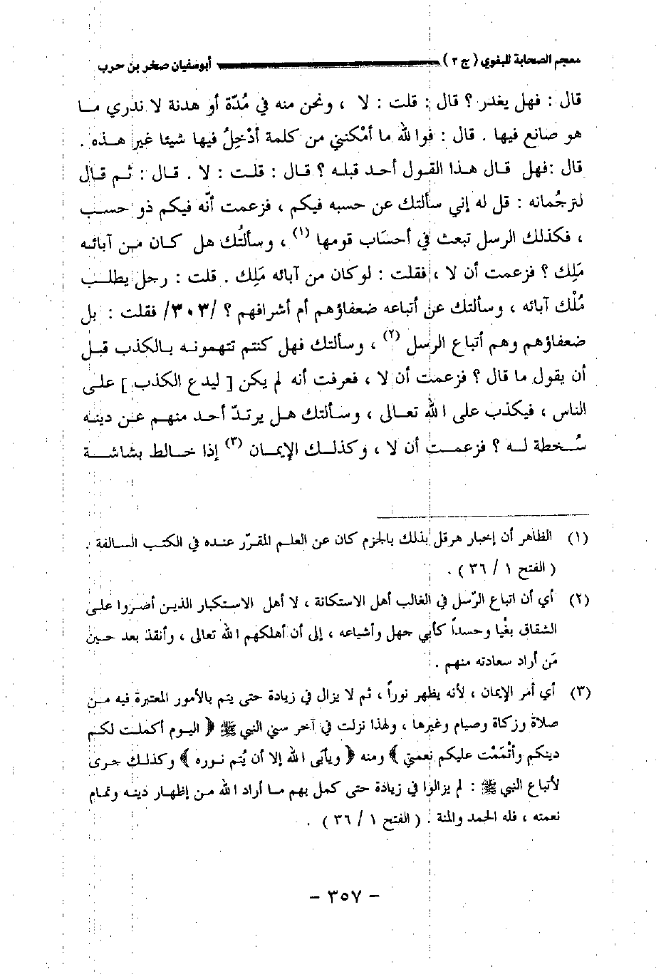 قال: فهل يغدر؟ قلت: لا، ونحن منه في مدة لا ندري ما هو صانع فيها قال: فوالله ما أمكنني من كلمة أدخل فيها غير هذه قال: فهل قال هذا القول أحد قبله؟ قال: قلت: لا، قال ثم قال لترجمانه: قل له إني سألتكم عن حسبه فيكم فزعمت أنه فيكم ذو حسب، فكذلك الرسل تبعث في أحساب قومها، وسألتك هل كان في آبائه ملك؟ فزعمت أن: لا، فقلت: لو كان من آبائه ملك، قلت رجل يطلب ملك آبائه، وسألتك عن أتباعه ضعفاؤهم أم أشرافهم؟ //٣٠٣// فقلت: بل ضعفاؤهم، وهم أتباع الرسل، وسألتك: فهل كنتم تتهمونه بالكذب قبل أن يقول ما قال؟ فزعمت أن: لا، فعرفت أنه لم يكن [ليدع الكذب] على الناس، فيكذب على الله تعالى وسألتك هل يرتد أحد منهم عن دينه سخطة له؟ فزعمت أن: لا، وكذلك الإيمان إذا خالط بشاشة