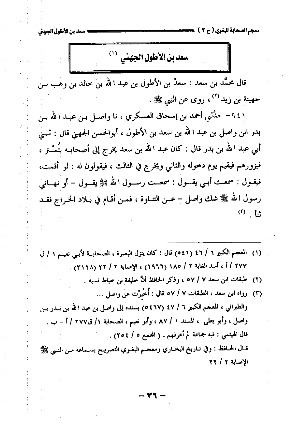 ٩٤١ - حدثني أحمد بن إسحاق العسكري نا واصل بن عبد الله بن بدر ابن واصل بن عبد الله بن سعد بن الأطول أبو الحسن الجهني قال: حدثني أبي عبد الله بن بدر قال: كان عبد الله بن سعد يخرج إلى أصحابه بتستر فيزورهم فيقيم يوم دخوله والثاني ويخرج في الثالث فيقولون له: لو أقمت فيقول: سمعت أبي يقول: سمعت رسول الله صلى الله عليه وسلم يقول أو نهاني رسول الله صلى الله عليه وسلم شك واصل عن التناوة فمن أقام في بلاد الخراج فقد ثنأ.