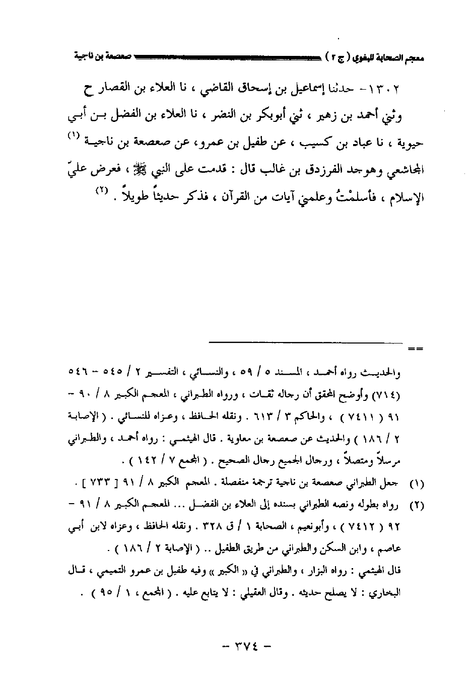 ١٣٠٢ - حدثنا إسماعيل بن إسحاق القاضي نا العلاء بن القصار ح وحدثني أحمد بن زهير حدثني أبو بكر بن النضر نا العلاء بن الفضل بن أبي حيوية نا عباد بن كسيب عن طفيل بن عمرو عن صعصعة بن ناجية المجاشعي وهو جد الفرزدق بن غالب قال: قدمت على النبي صلى الله عليه وسلم فعرض علي الإسلام فأسلمت وعلمني آيات من القرآن فذكر حديثا طويلا.
