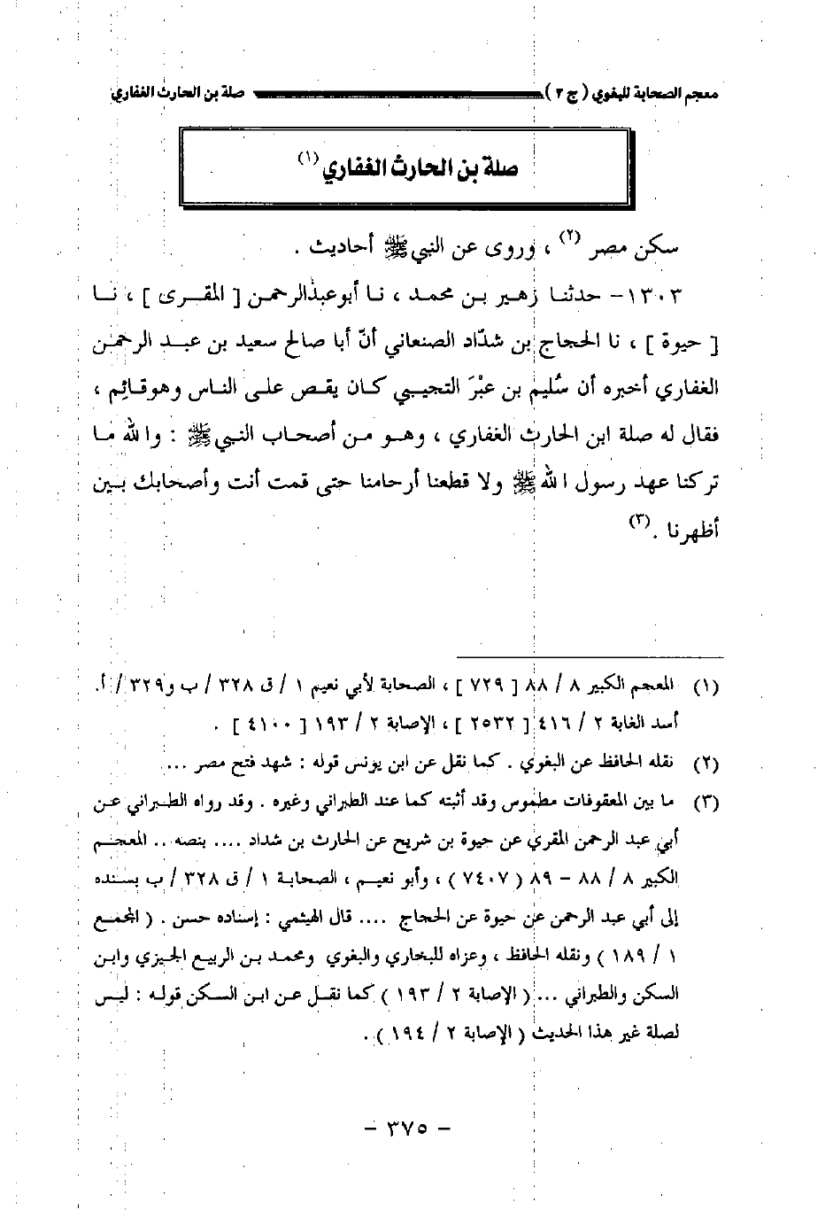 ١٣٠٣ - حدثنا زهير بن محمد نا أبو عبد الرحمن [المقري] نا [حيوة] نا الحجاج بن شداد الصنعاني أن أبا صالح سعيد بن عبد الرحمن الغفاري أخبره أن سليم بن عبر التجيبي كان يقص على الناس وهو قائم فقال له صلة بن الحارث الغفاري وهو من أصحاب النبي صلى الله عليه وسلم: والله ما تركنا عهد رسول الله صلى الله عليه وسلم ولا قطعنا أرحامنا حتى قمت أنت وأصحابك بين أظهرنا.