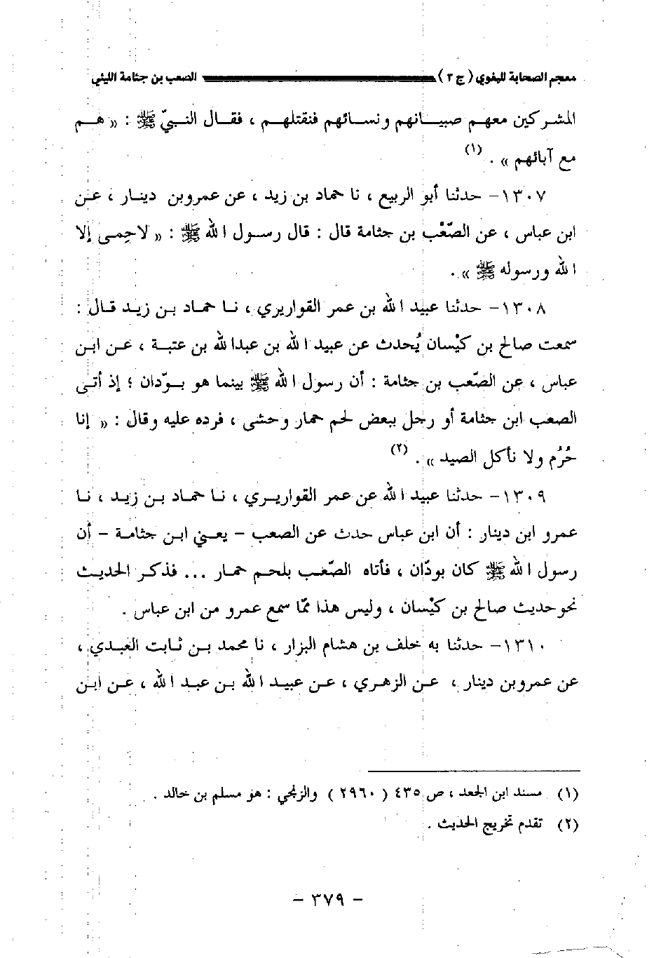 ١٣٠٩ - حدثنا عبيد الله عن عمر القواريري نا حماد بن زيد نا عمرو بن دينار أن ابن عباس حدثنا عن الصعب - يعني ابن جثامة - أن رسول الله صلى الله عليه وسلم كان بودان فأتاه الصعب بلحم حمار ... فذكر الحديث نحو حديث صالح بن كيسان وليس هذا مما سمع عمرو من ابن عباس.
