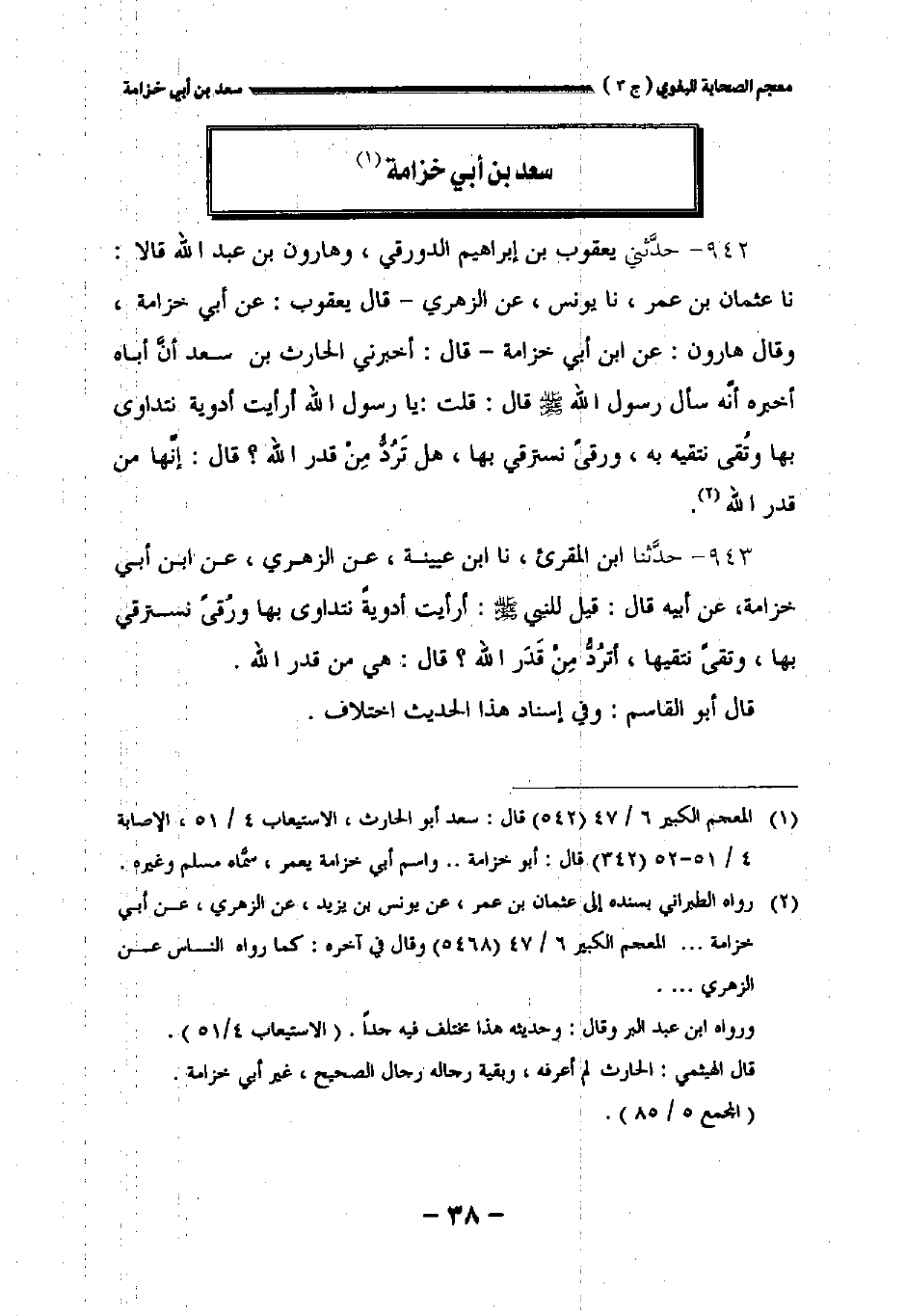 ٩٤٢ - حدثني يعقوب بن إبراهيم الدورقي وهارون بن عبد الله قالا: نا عثمان بن عمر نا يونس عن الزهري قال يعقوب: عن أبي خزامة وقال هارون: عن ابن أبي خزامة قال: أخبرني الحارث بن سعد أن أباه أخبره أنه سأل رسول الله صلى الله عليه وسلم قال: قلت: يارسول الله أرأيت أدوية نتداوى بها وتقى نتقيه به ورقى نسترقي بها هل ترد من قدر الله؟ قال: إنها من قدر الله.