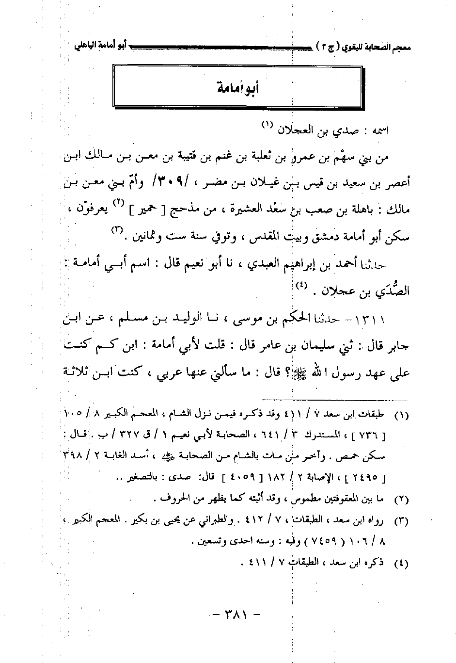 اسمه صدي بن العجلان. من بني سهم بن عمرو بن ثعلبة بن غنم بن قتيبة بن معن بن مالك بن أعصر بن سعيد بن قيس بن غيلان بن مضر، //٣٠٩// وأم بني معن بن مالك: باهلة بن صعب بن سعد العشيرة من مذحج [حمير] يعرفون سكن، أبو أمامة دمشق وبيت المقدس وتوفي سنة ست وثمانين.