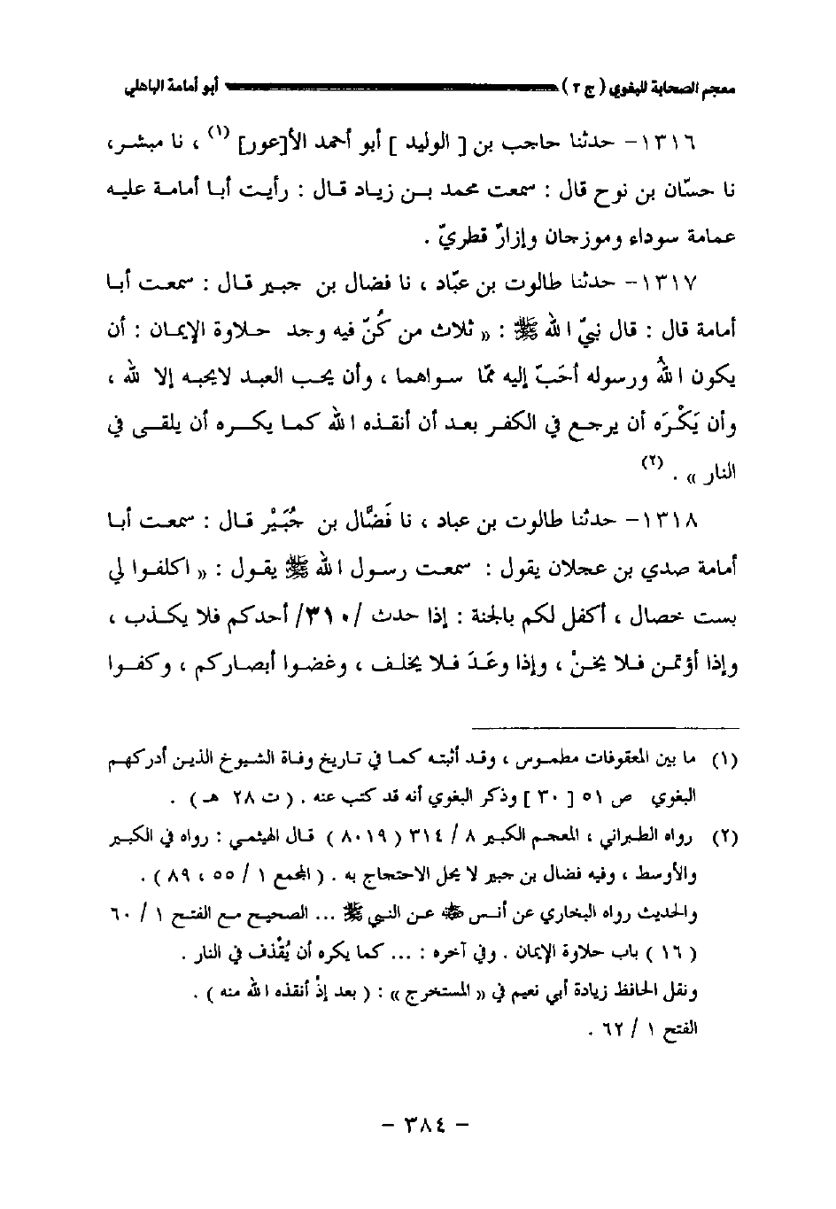 ١٣١٧ - حدثنا طالوت بن عباد نا فضال بن جبير قال: سمعت أبا أمامة قال: قال نبي الله صلى الله عليه وسلم: " ثلاث من كن فيه وجد حلاوة الإيمان: أن يكون الله ورسوله أحب إليه مما سواهما وأن يحب العبد لا يحبه إلا لله وأن يكره أن يرجع في الكفر بعد أن أنقذه الله كما يكره أن يلقى في النار.