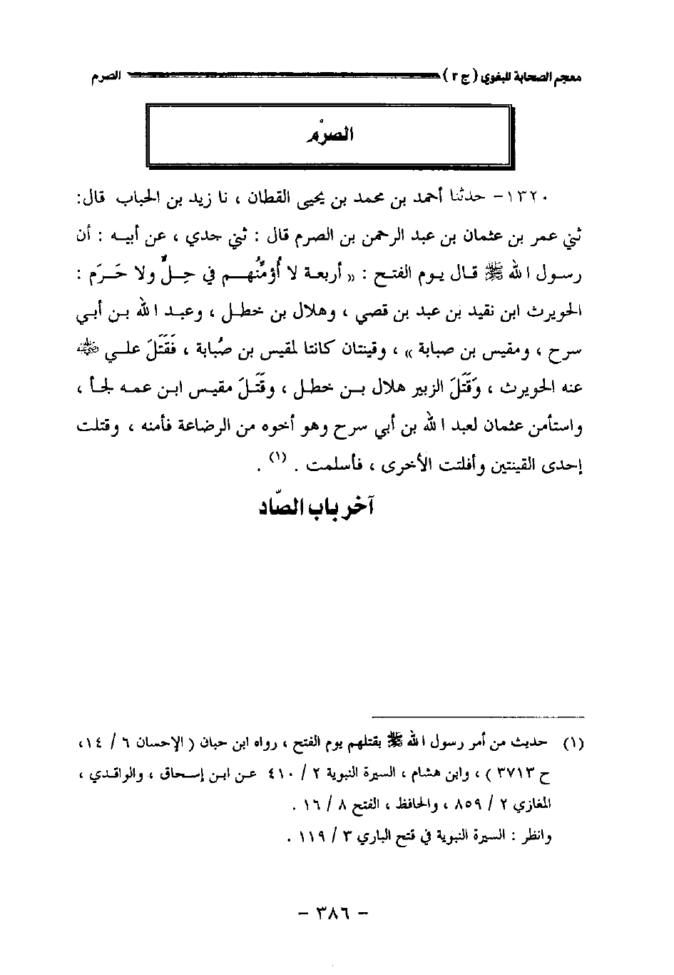 ١٣٢٠ - حدثنا أحمد بن محمد بن يحيى القطان نا زيد بن الحباب قال: ثني عمر بن عثمان بن عبد الرحمن بن الصرم قال: حدثني جدي عن أبيه أن رسول الله صلى الله عليه وسلم قال يوم الفتح:" أربعة لا أؤمنهم في حل ولا حرام: الحويرث بن نقيد بن عبد بن قصي وهلال بن خطل وعبد الله بن أبي سرح ومقيس بن صبابة " وقينتان كانتا لمقيس بن صبابة فقتل علي رضي الله عنه الحويرث وقتل الزبير هلال بن خطل وقتل مقيس بن عمه لجأ واستأمن عثمان لعبد الله بن أبي سرح وهو أخوه من الرضاعة فأمنه وقتلت احدى القينتين وأفلتت الأخرى فأسلمت.